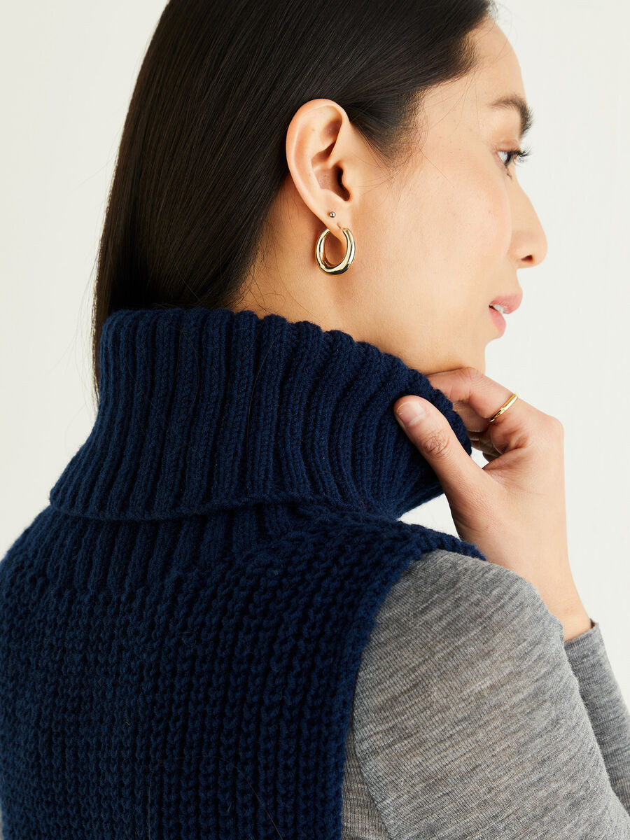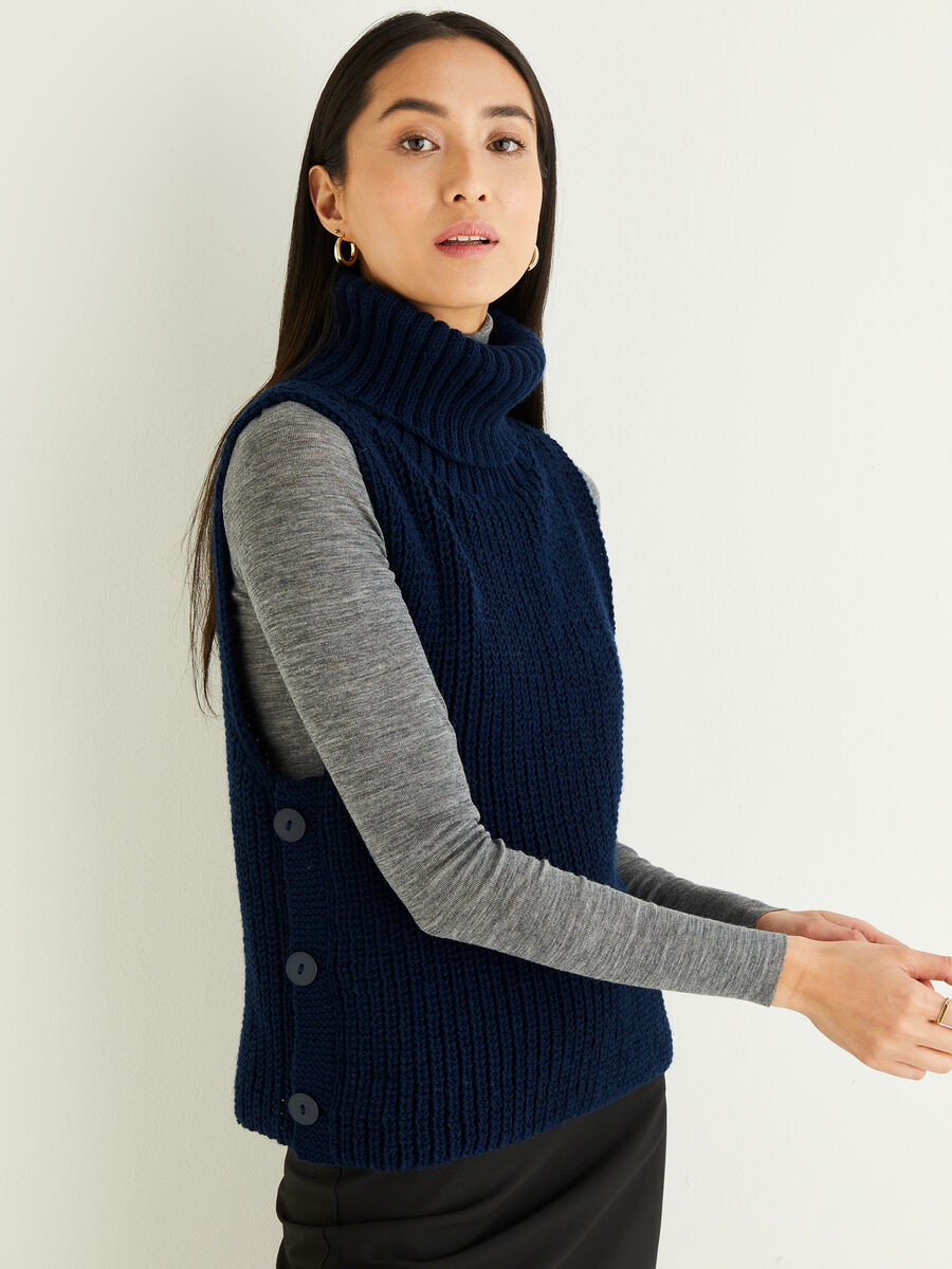Bring a classic, roll neck up-to-date as an on-trend sleeveless vest, with button down sides, perfect to show off pretty shirt sleeves. Cast on half fisherman rib to create a cosy layering piece you can wear with your smartest coat.