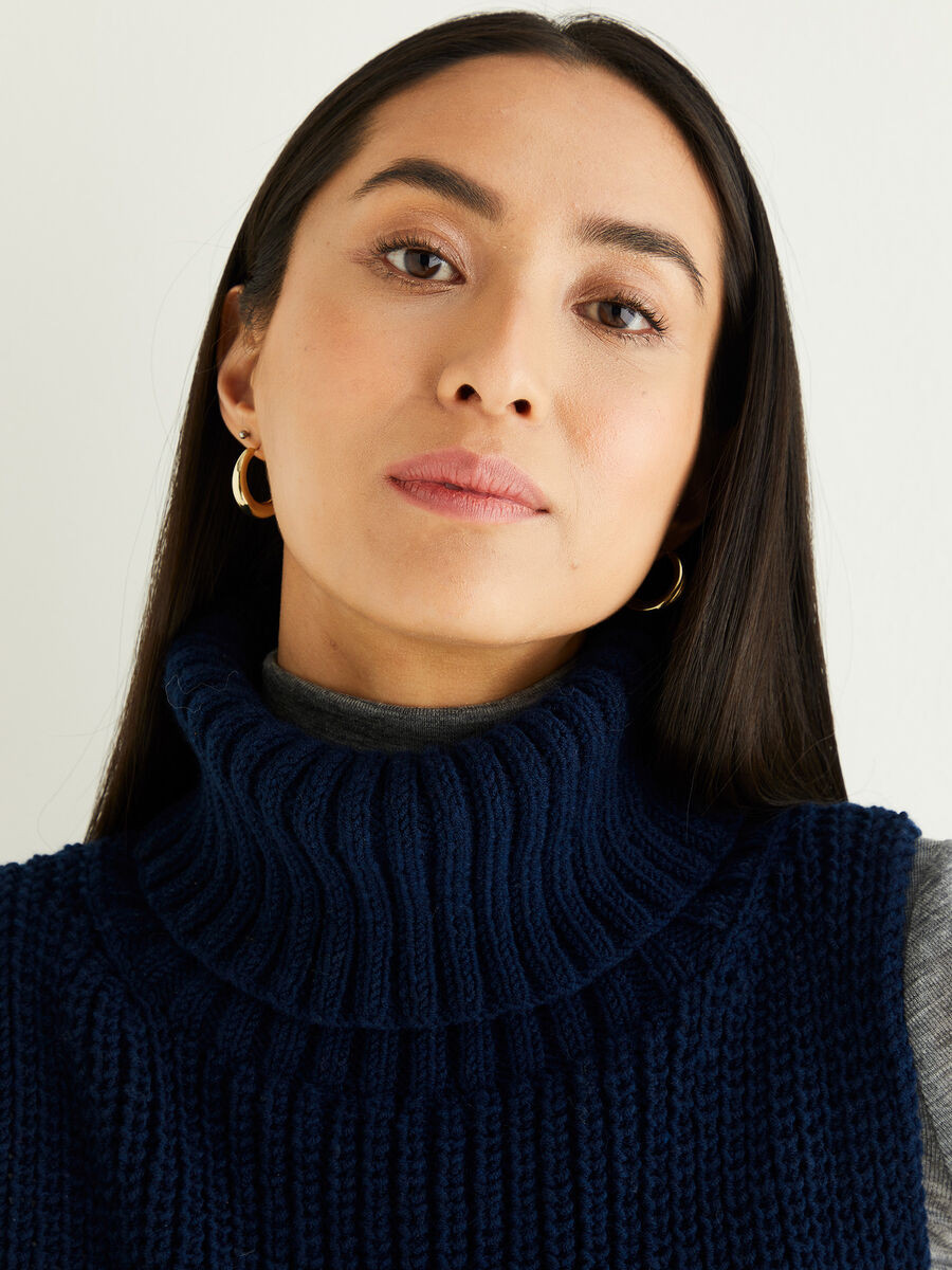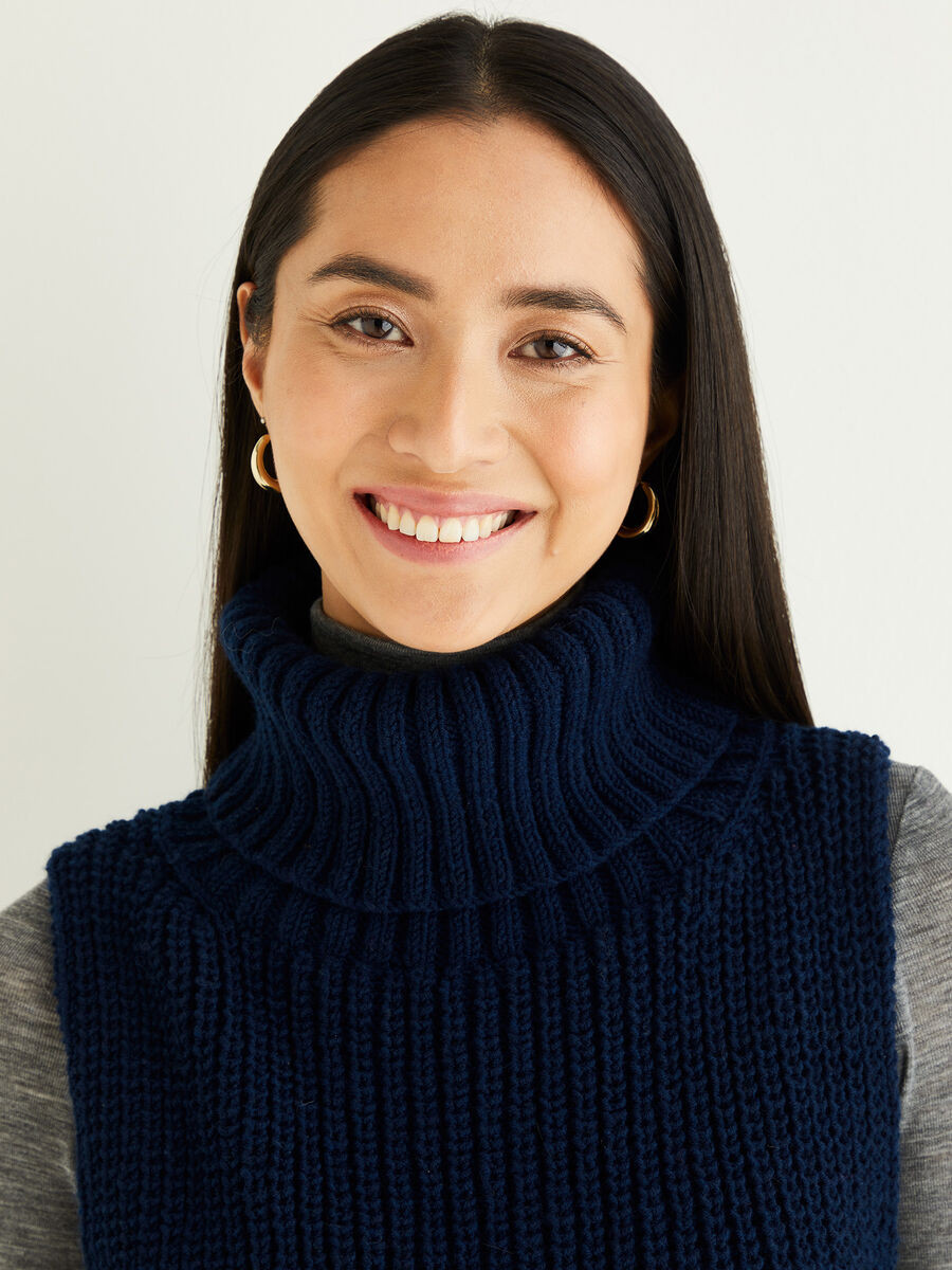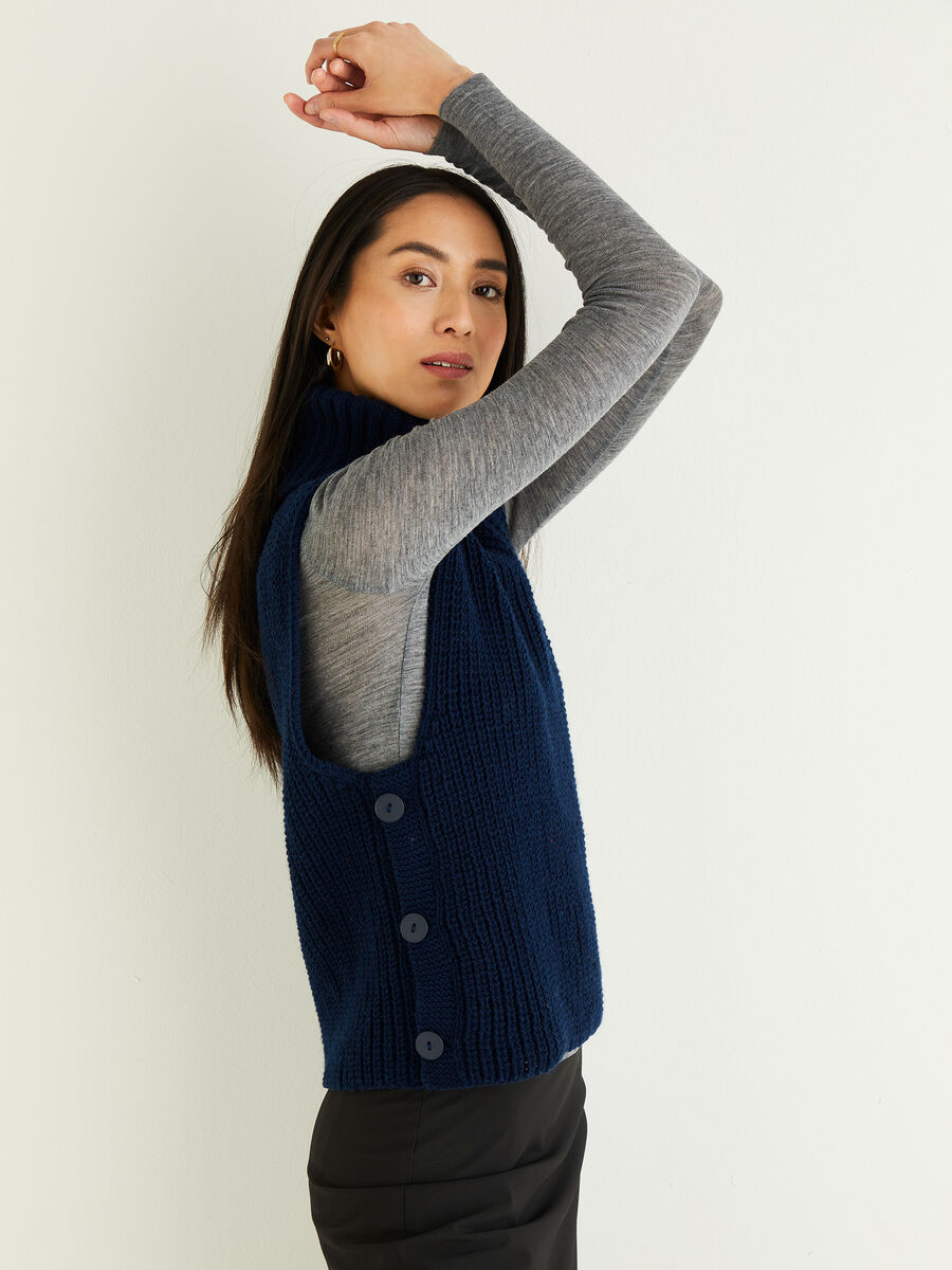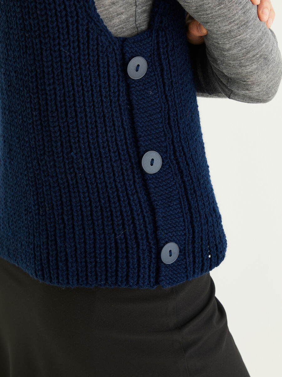 Bring a classic, roll neck up-to-date as an on-trend sleeveless vest, with button down sides, perfect to show off pretty shirt sleeves. Cast on half fisherman rib to create a cosy layering piece you can wear with your smartest coat.