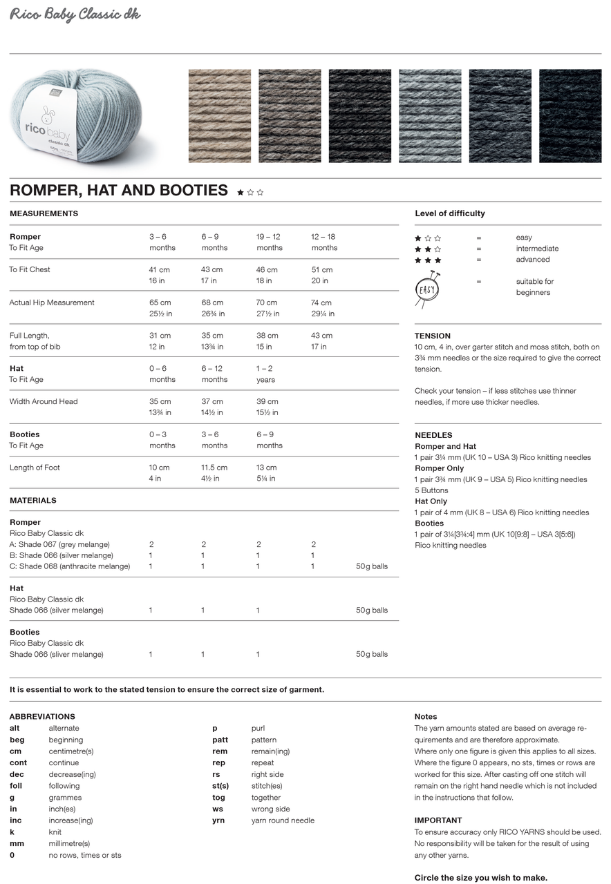 1 pair of 3.25mm (UK10 - USA3) Knitting Needles for Romper & Hat. 1 pair of 3.75mm (UK9 - USA6) Knitting Needles, 5 Buttons for Romper Only. 1 pair of 4.00mm (UK8 - USA6) Knitting Needles, for Hat Only. 1 pair of 3.25mm (UK10 - USA3) Knitting Needles for Booties.