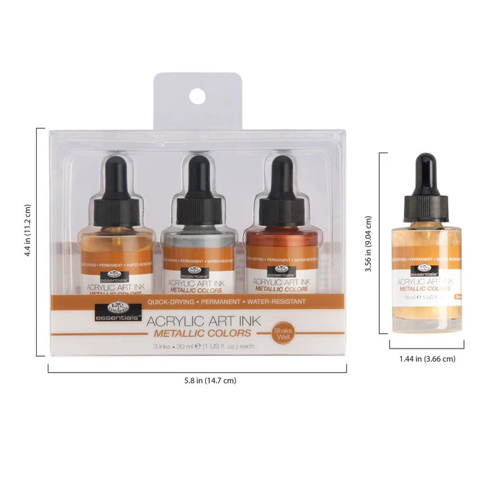 A range of extremely fluid, richly pigmented acrylic art ink in 3 30ml (1 US fl. oz.) bottles with droppers. This set includes metallic colors.