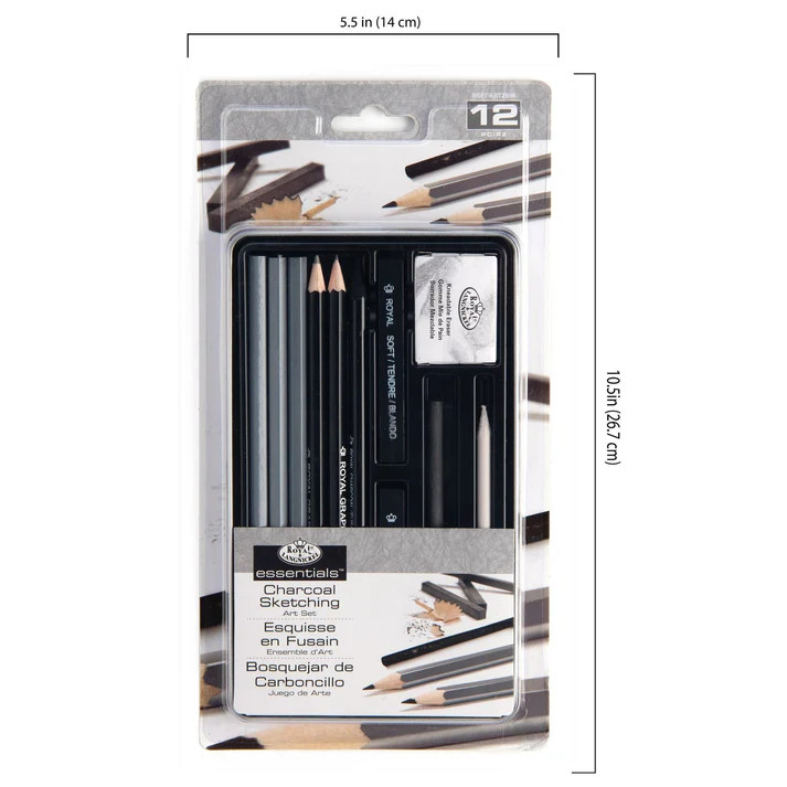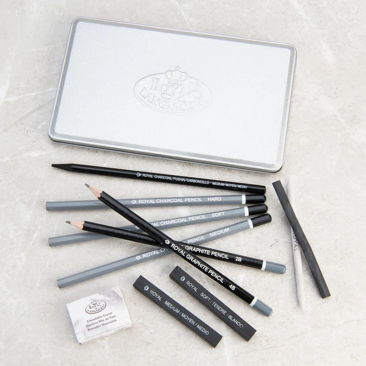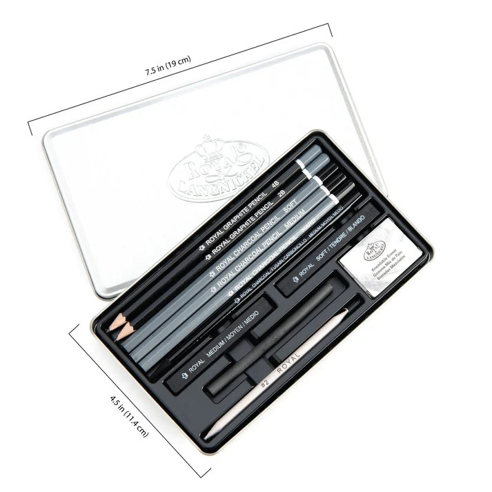 - CONTENTS - 3 charcoal pencils, 2 graophite pencils, 2 charcoal sticks, a woodless charcoal pencil, vien charcoal, blending stump, and kneadable eraser all stored in a copmact metal tin