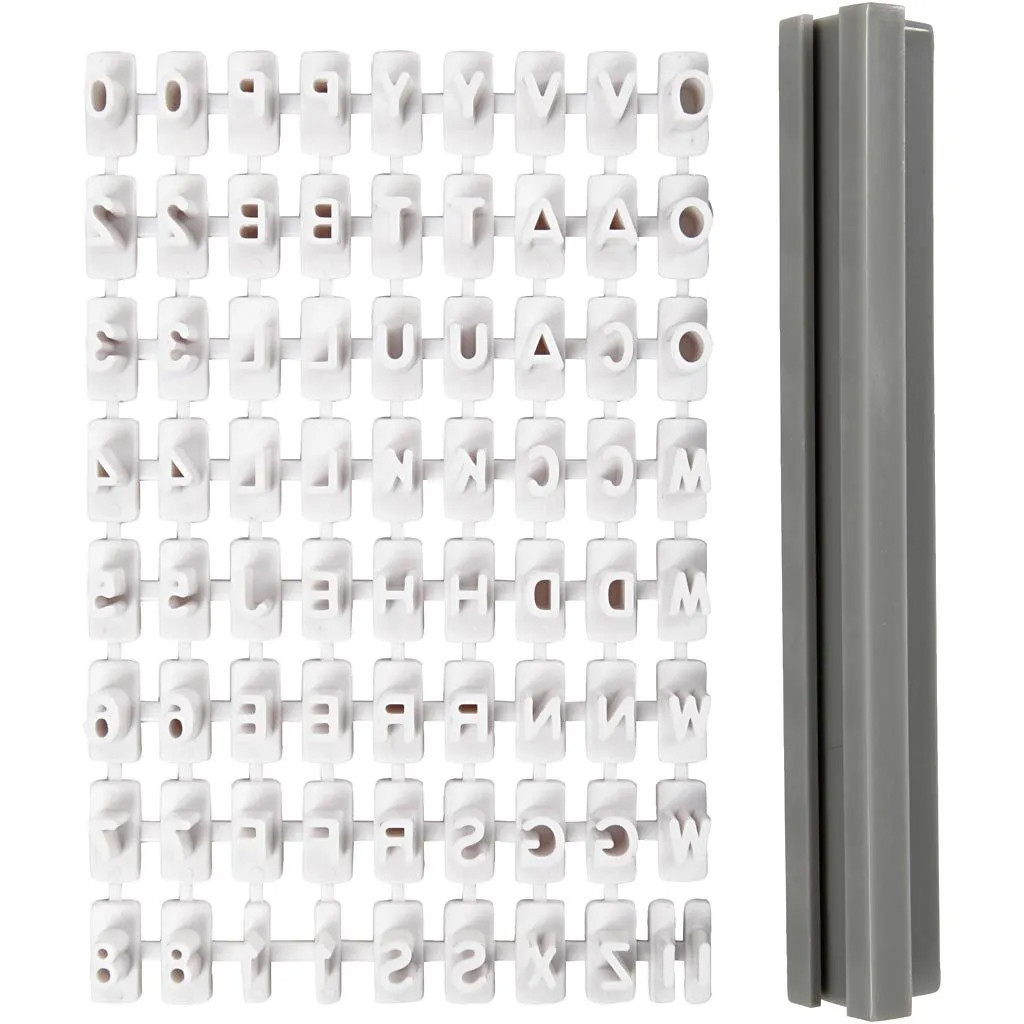 Rubber stamps set with numbers and letters in hard plastic. Incl. holder. Can be used with many types of clay, Silk Clay and so on. Rinse the stamps in water immediately after use.