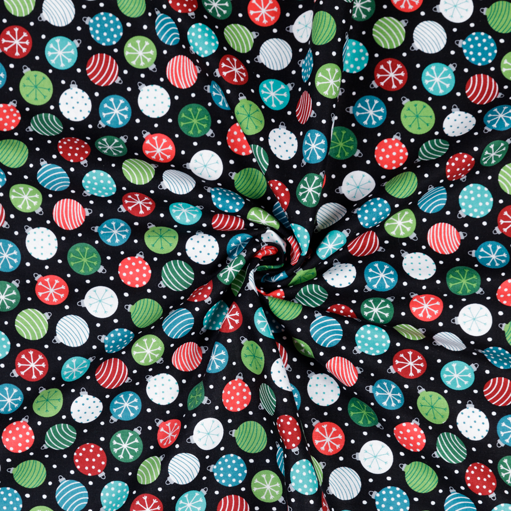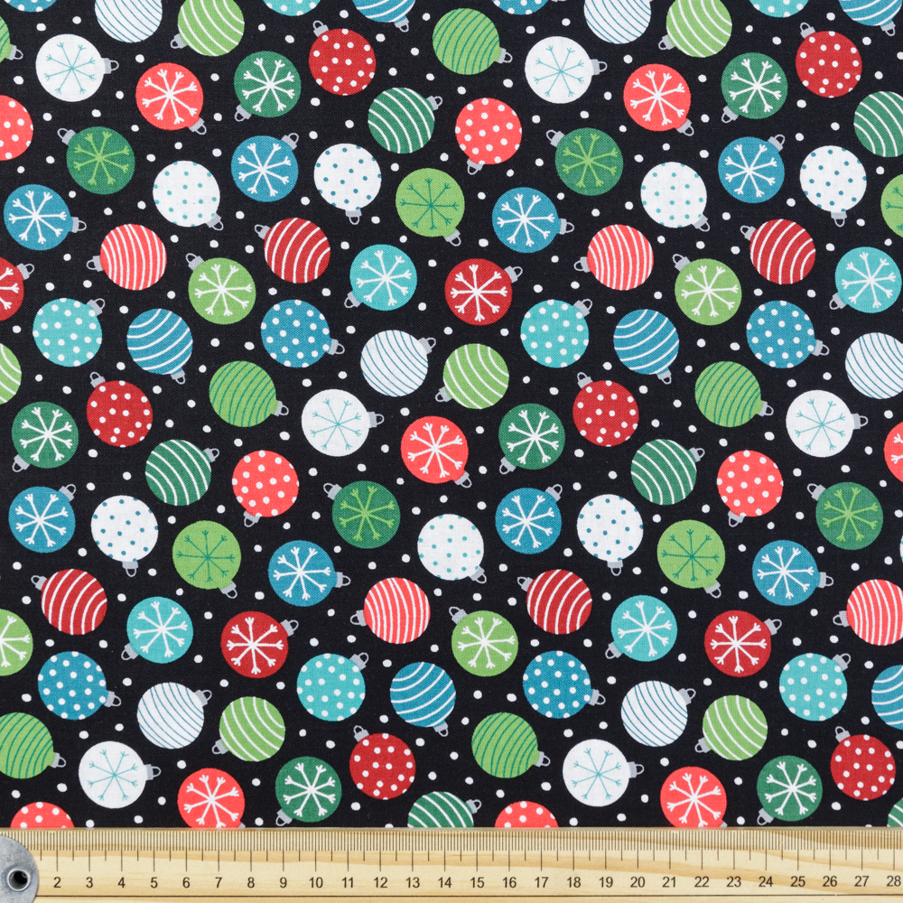 Bright and colourful baubles really pop against this black background. Beautiful, high quality, printed cotton fabric. Ideal for quilting, masks, crafts, displays, table decoration and as a dressmaking fabric.