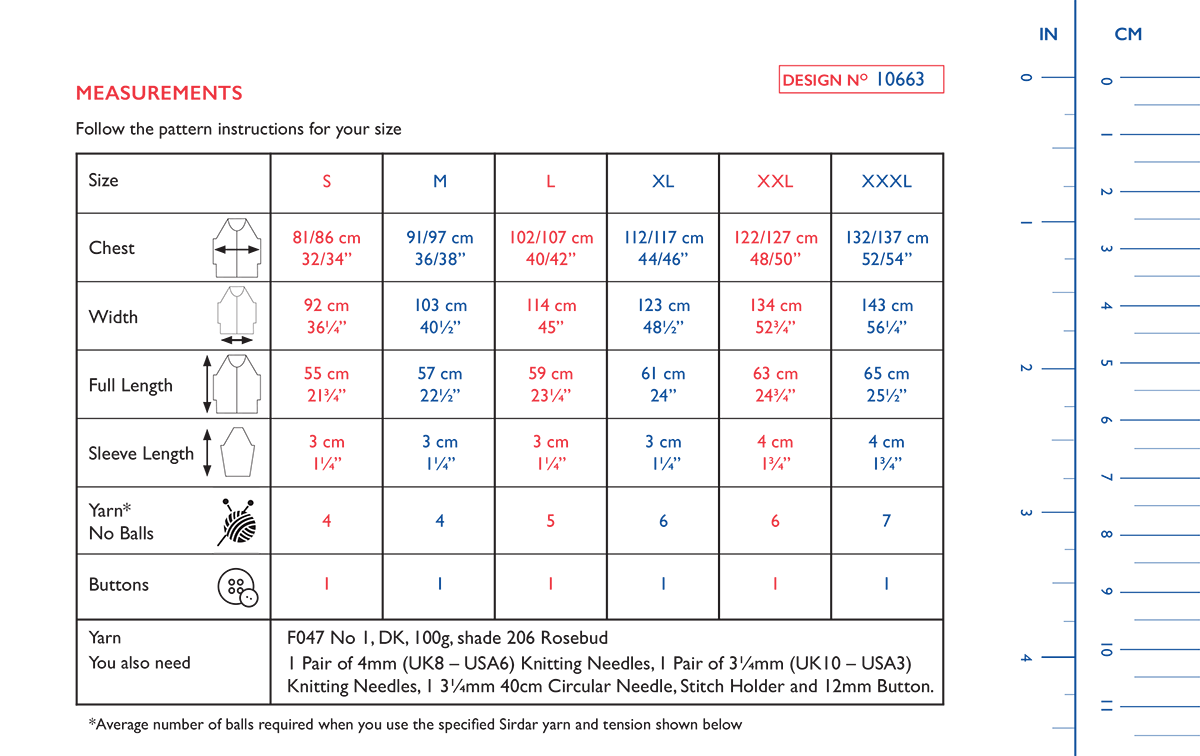 1 Pair of 4mm (UK8 – USA6) Knitting Needles, 1 Pair of 3¼mm (UK10 – USA3) Knitting Needles, 1 3¼mm 40cm Circular Needle, Stitch Holder and 1 x 12mm Button.