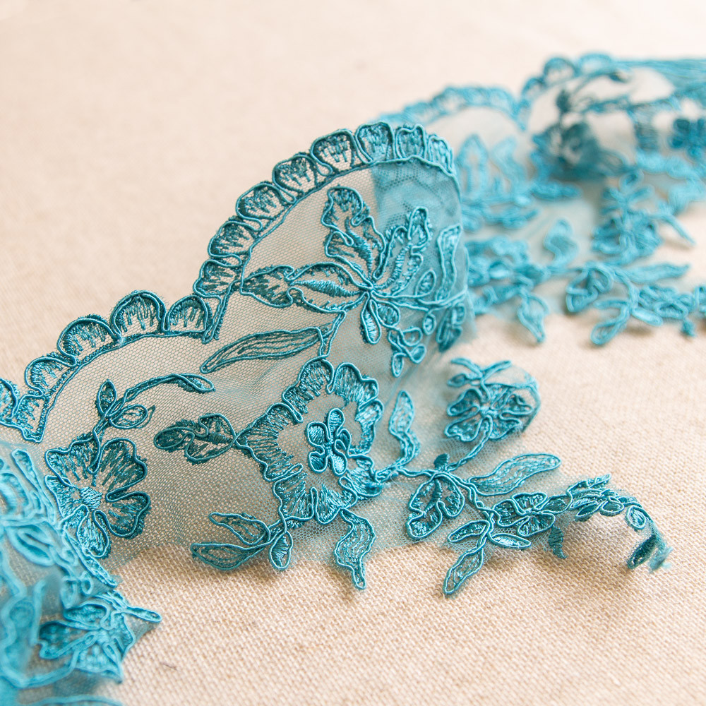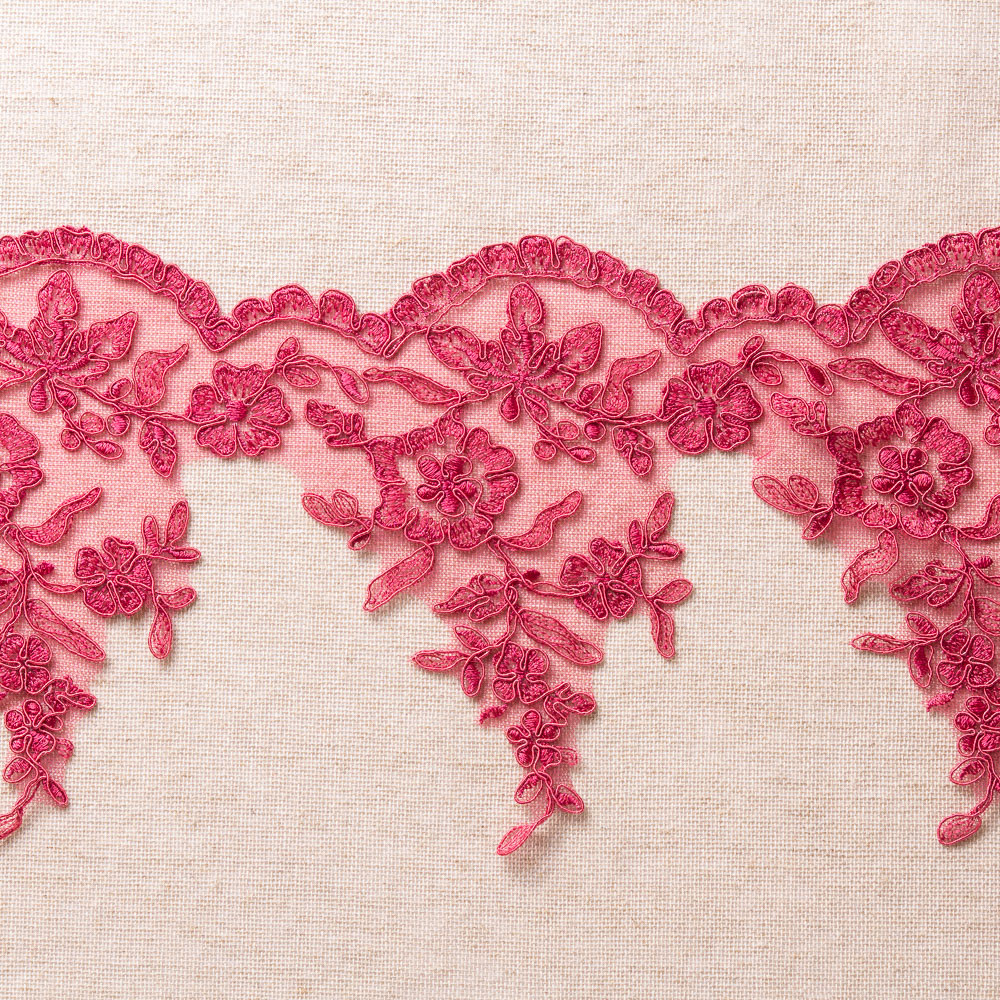 Beautiful lace trim with a floral design. One side is scalloped and the other has trailing flowers. Use it for waistbands, dresses, or necklines. You can also apply it to home decor applications. 180mm at the longest point and 55mm at the thinnest point.