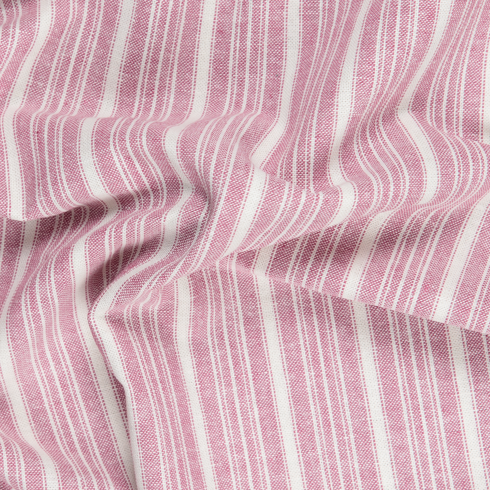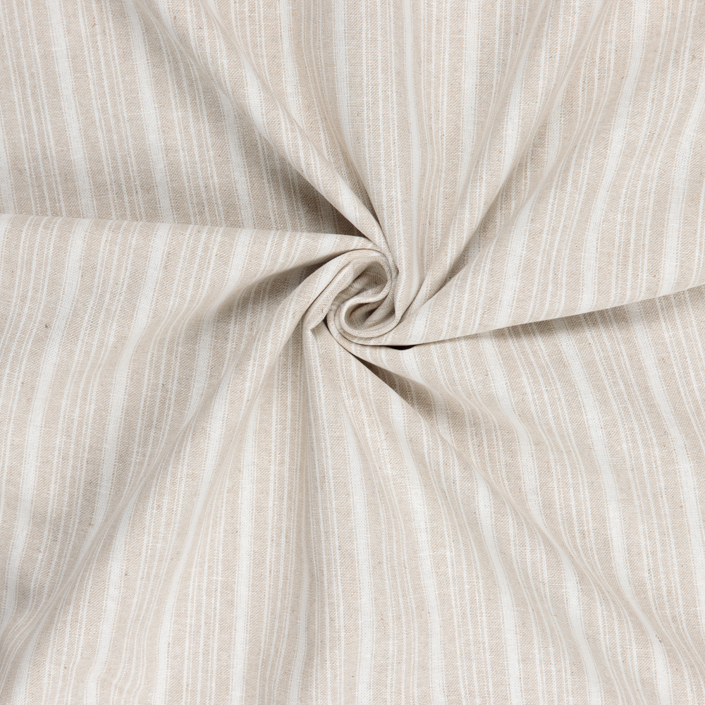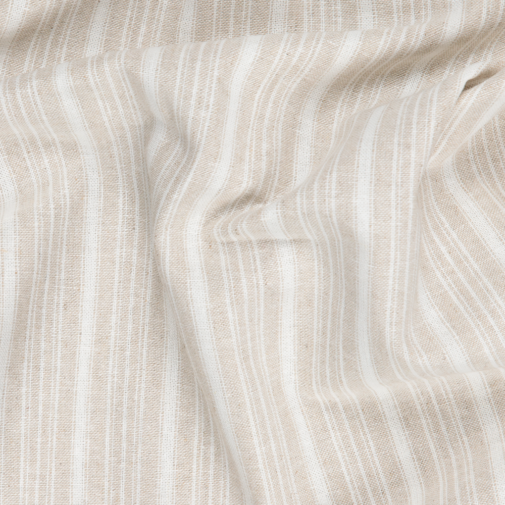 A breathable linen-cotton blend featuring a subtle vertical tone-on-tone self stripe. Crisp to the touch with a structured drape, yet comfortable and wearable in warm weather.