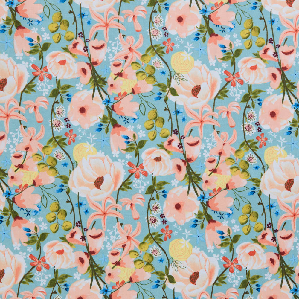 Large scale painted flowers on duckegg blue. Beautiful, high quality, printed cotton fabric. Ideal for quilting, masks, crafts, displays, table decoration and as a dressmaking fabric.