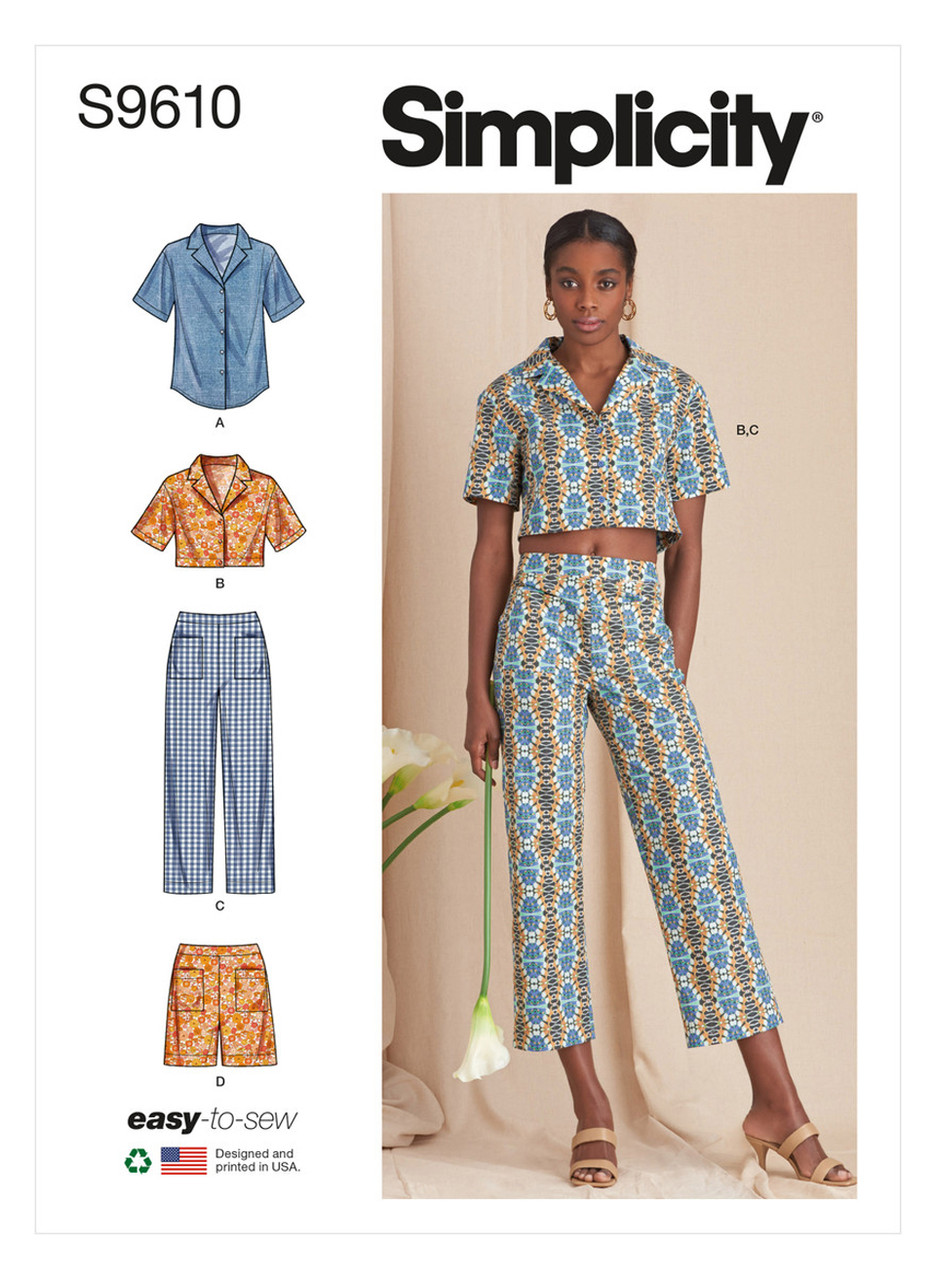 Relaxed shirt with back yoke and cropped shirt with open back have dropped shoulders and elbow length sleeves. Straight leg cropped pants and shorts have patch pocket details.