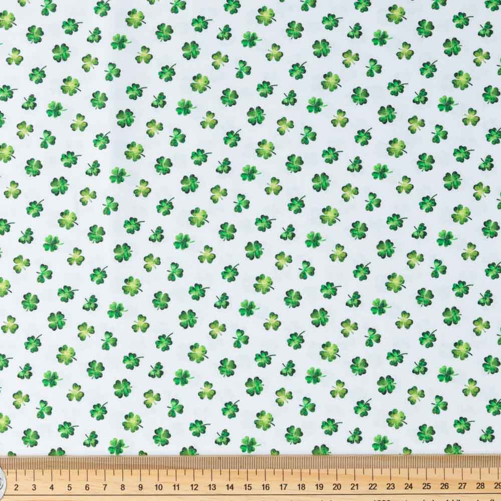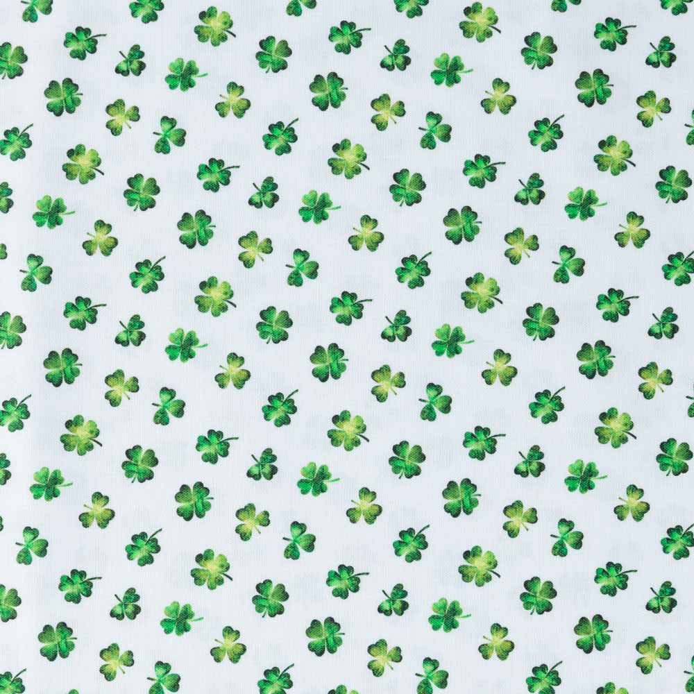 Allover shamrock print on white. Beautiful, high quality, printed cotton fabric. Ideal for quilting, masks, crafts, displays, table decoration and as a dressmaking fabric.