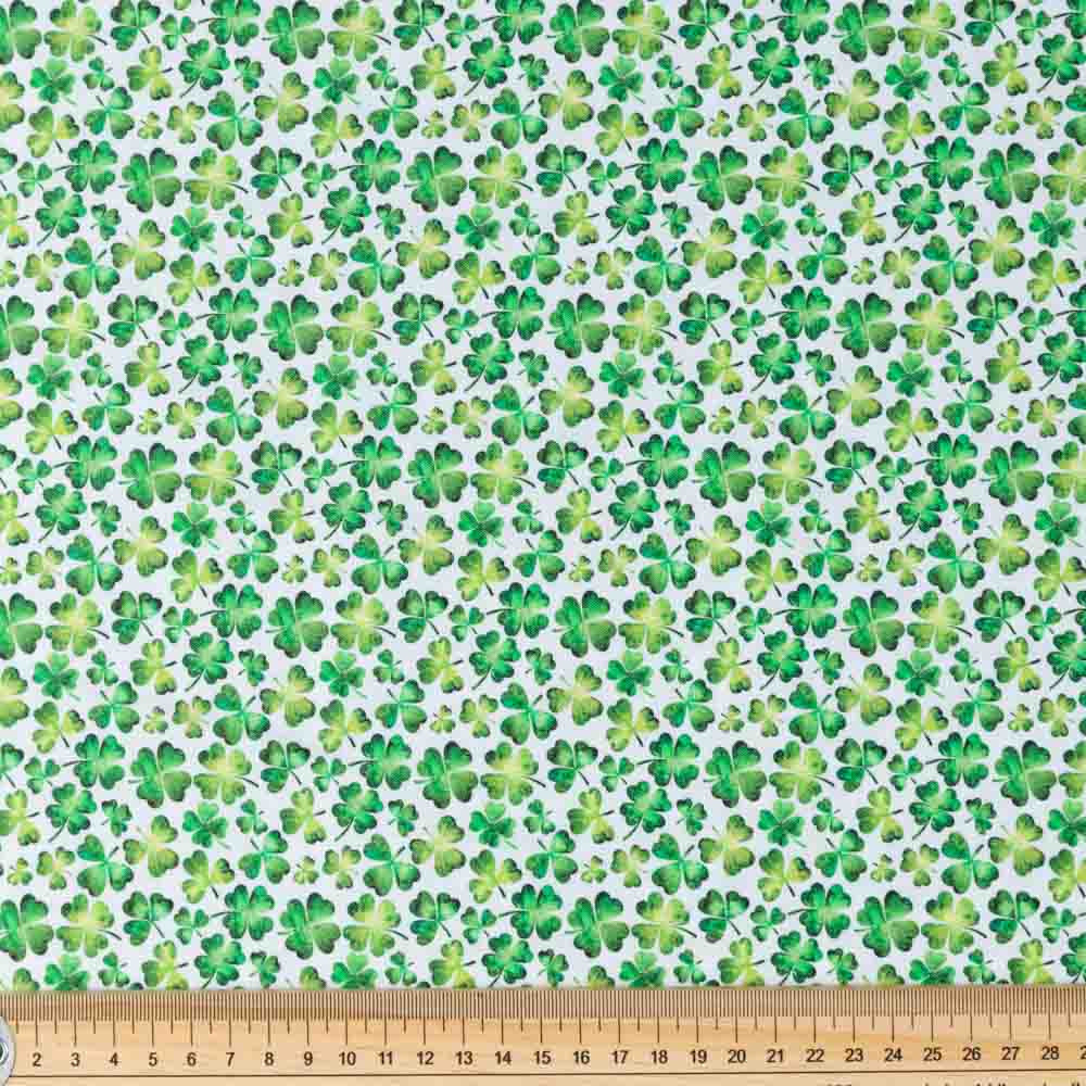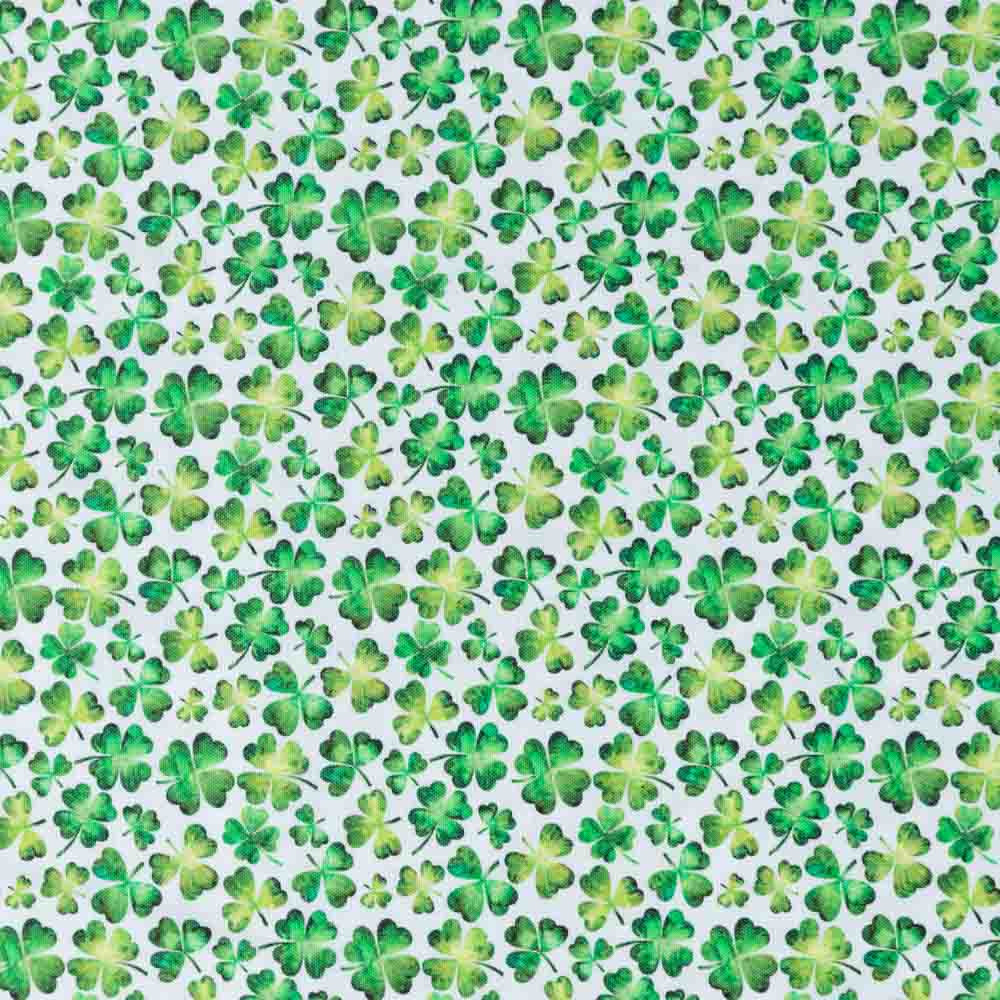 Allover shamrock print on white. Beautiful, high quality, printed cotton fabric. Ideal for quilting, masks, crafts, displays, table decoration and as a dressmaking fabric.