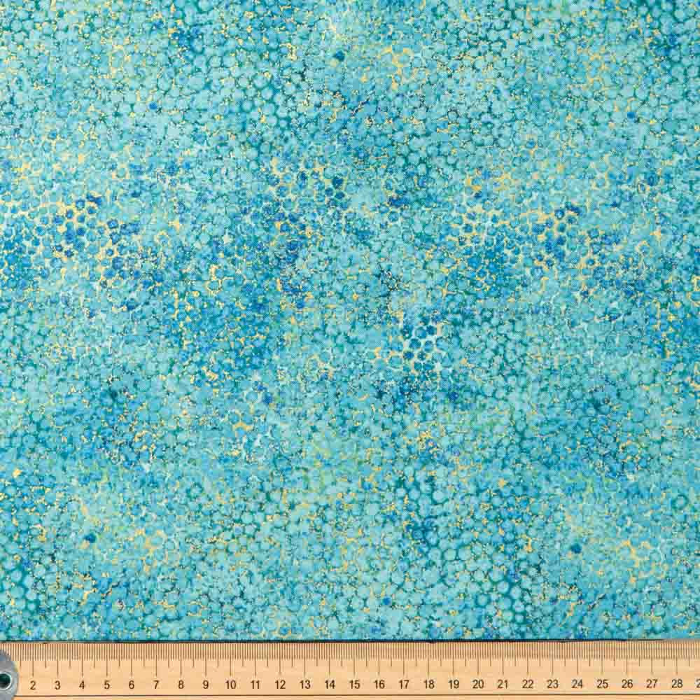 Mini circles surrounded by a metallic gold shading in tones of aqua and turquoise. Beautiful, high quality, printed cotton fabric. Ideal for quilting, masks, crafts, displays, table decoration and as a dressmaking fabric.