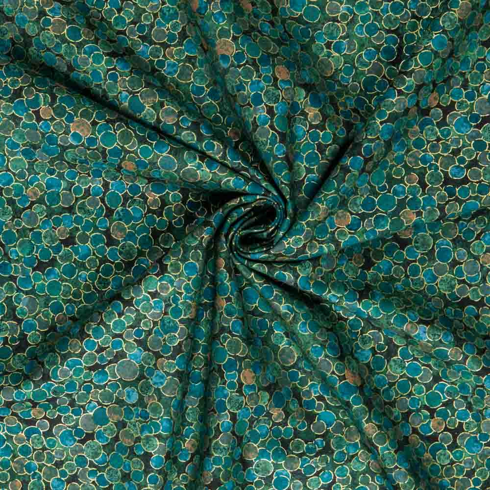 Small circles surrounded by a metallic gold outline in tones of green, blue and brown. Beautiful, high quality, printed cotton fabric. Ideal for quilting, masks, crafts, displays, table decoration and as a dressmaking fabric.