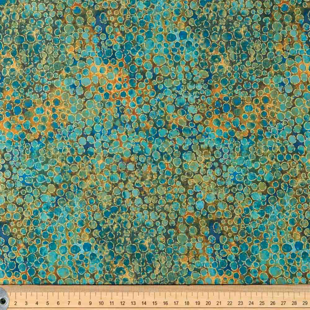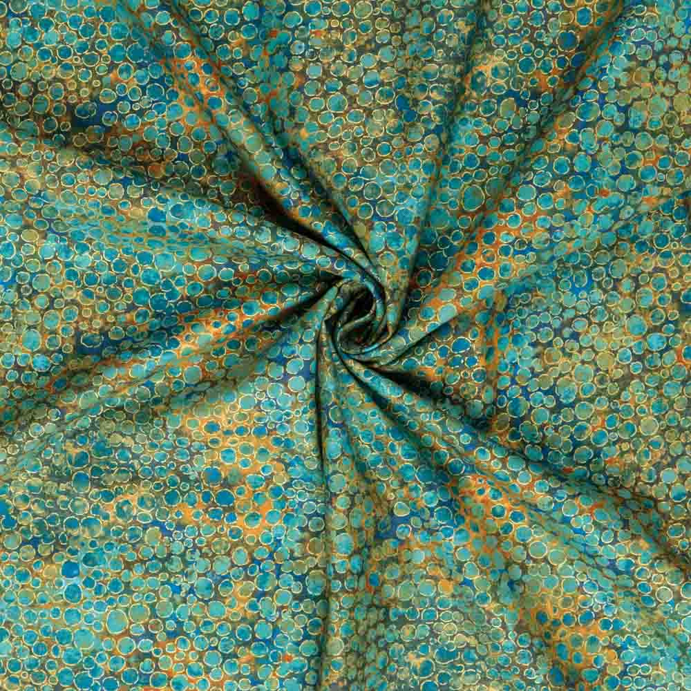 Small circles surrounded by a metallic gold outline in tones of green, blue and orange. Beautiful, high quality, printed cotton fabric. Ideal for quilting, masks, crafts, displays, table decoration and as a dressmaking fabric.