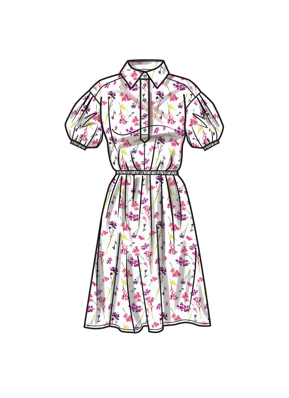 Relaxed fit shirt dress with elastic waist and side seam pockets. Includes an optional pointed collar and placket that can be made in a contrasting fabric. Dress has a forward drop shoulder with full pleated sleeves and elastic closures in two sleeve length variations. Dress also comes in two length options as well as an optional cut out at the back waist.