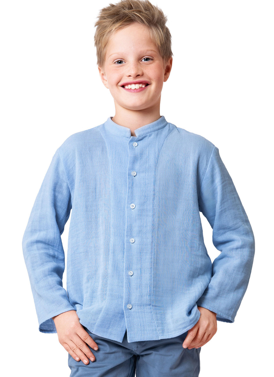 With this shirt pattern from Burda kids, you can sew two cool variations—perfect for beginners! Whether classic with a stand-up collar or casual as a short-sleeve shirt with a chest pocket, both designs are great for everyday wear. Thanks to the wrinkle-resistant organic muslin, the shirt stays in shape beautifully.