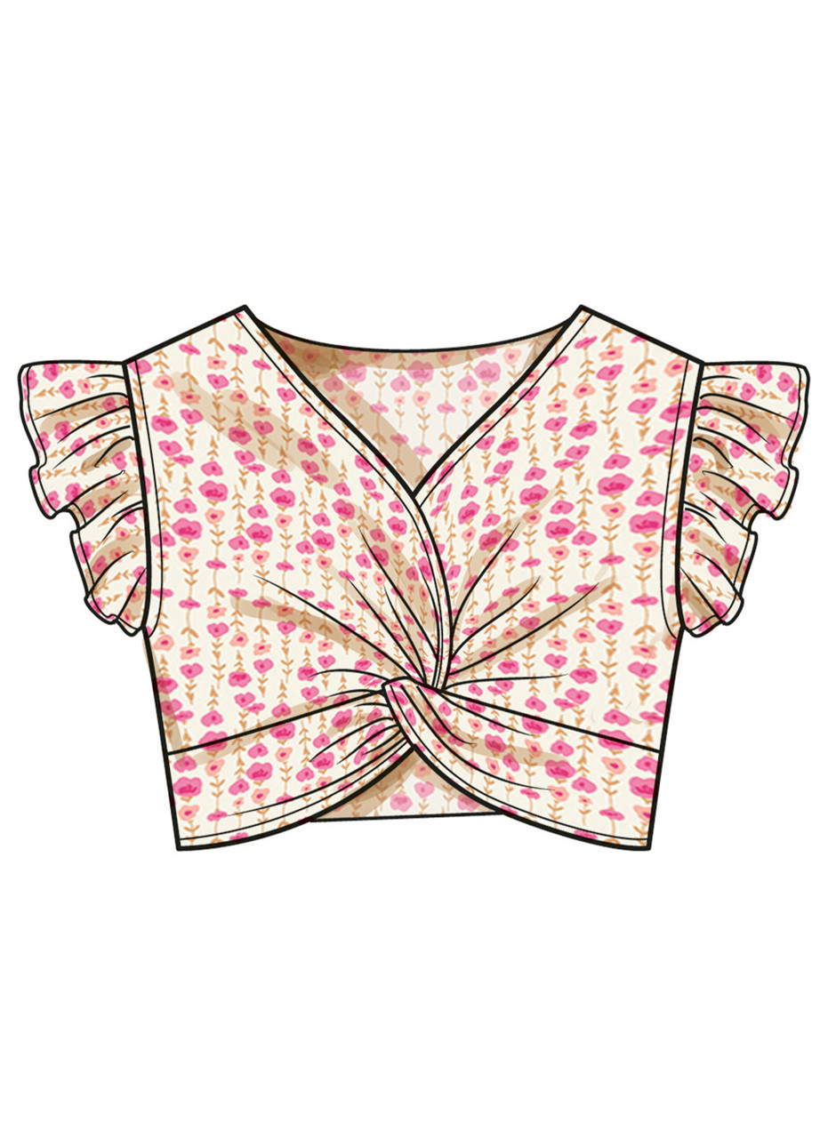 Make a summer outfit for your toddler with these shorts, pants, hat and knit top patterns. Knit top has ruffle sleeves and twist detail can be worn front or back. Shorts and pants have elastic waistband, side seam pockets and optional self-ties. Hat in three sizes S (18) -M (19)- L (20).
