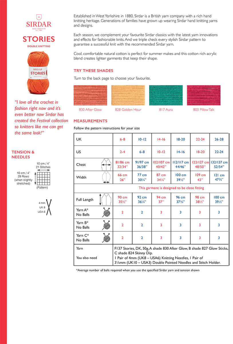 To construct this striped mini dress, you’ll knit broken rib to give you those textured stripes and then icord stitch for the straps to keep it simple. This may look like a basic garment, but you have the customisable option of picking three fun Sirdar Stories shades.