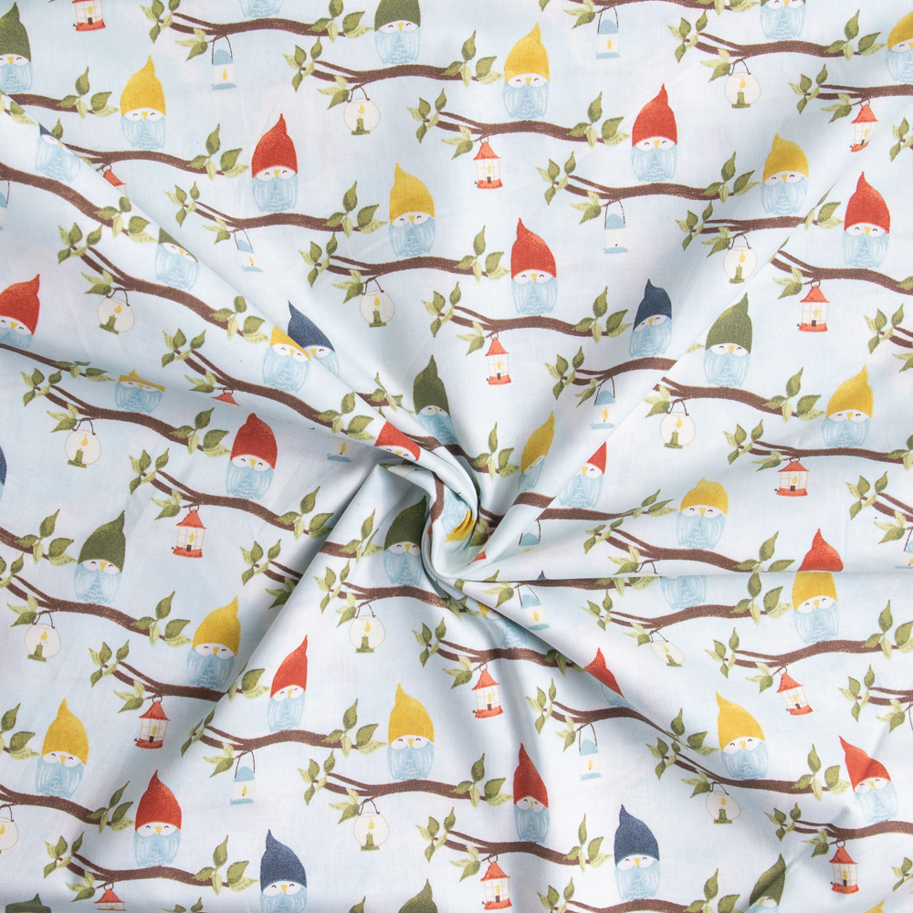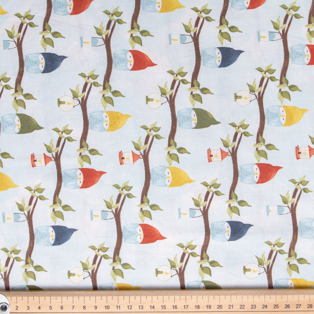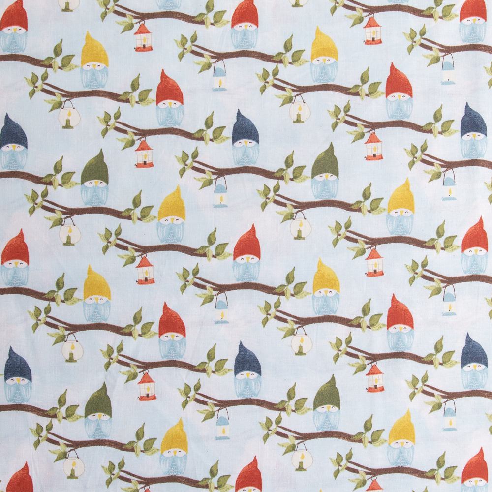 Adorable hatted owls in Autumn tones create this allover pattern on sky blue.Beautiful, high quality, printed cotton fabric. Ideal for quilting, masks, crafts, displays, table decoration and as a dressmaking fabric.