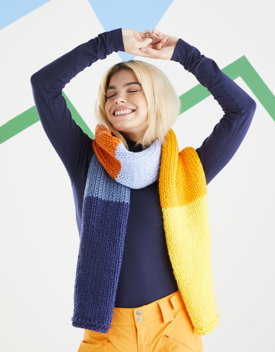 This knitting pattern, from our Off-Piste collection includes two designs, one simple colour block scarf inspired by a winter sunrise and ideal for beginners, the second introduces the intarsia technique to create the bold SKI lettering.