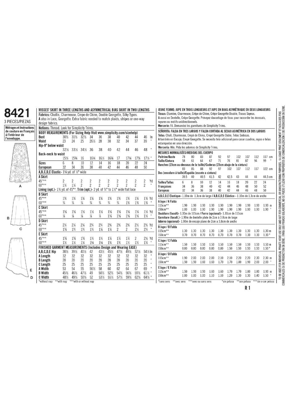 Easy to sew skirt with only three pattern pieces allows you to create multiple skirts styles in no time at all. Pattern has cutting lines for three different lengths and an asymmetrical option in two lengths. Great for silky type fabric and sheer or lace overlay. Simplicity sewing pattern by Karen Z.