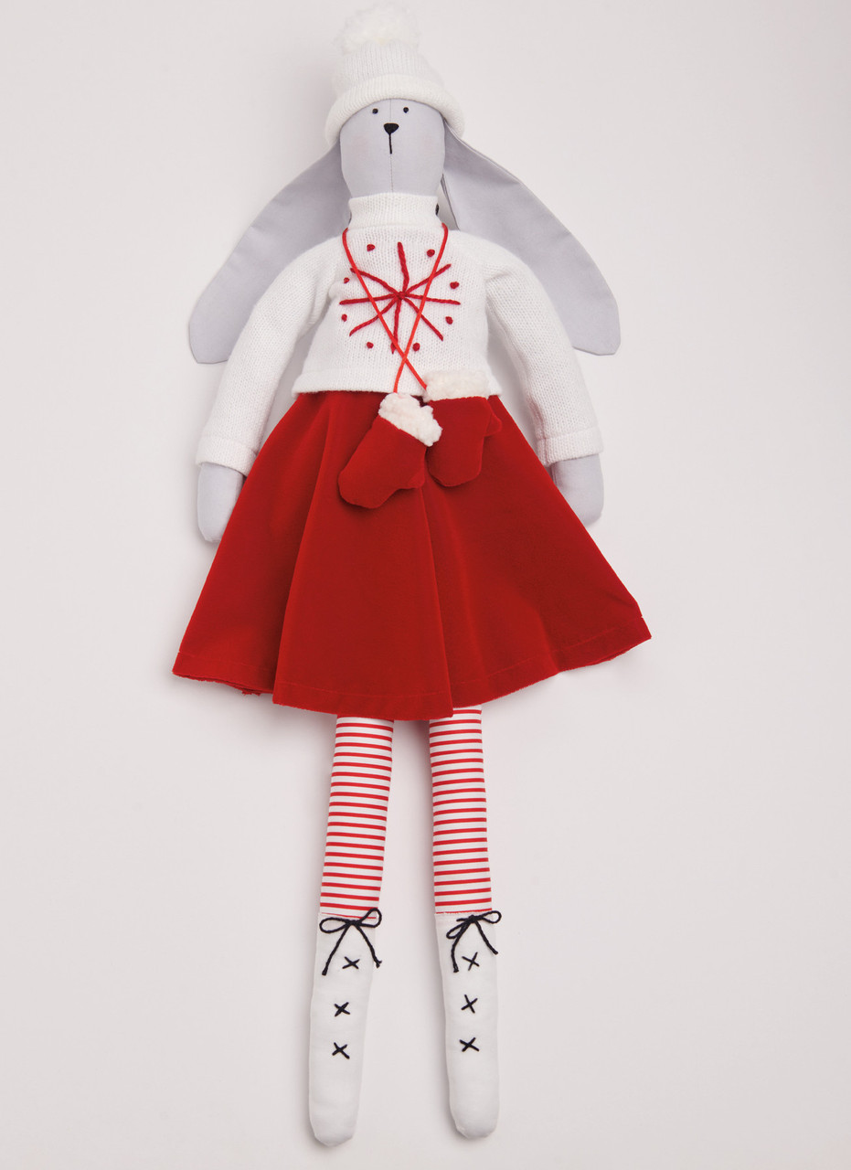 Slender 24" (61cm) plush bunnies have embroidered faces, floppy ears, and seasonal-themed wardrobes. Summer bunny has vintage-inspired bathing dress and bloomers with sailor collar; Spring bunny has top, cropped pants and pinafore embellished with eyelet trim. Autumn bunny has sweater, long flared skirt and faux boots. Winter bunny has embroidered sweater, knit beanie with pom pom and skater skirt. Scan the QR code for star, flower basket, tote bag and mitten accessory free instructions. See envelope for more information.