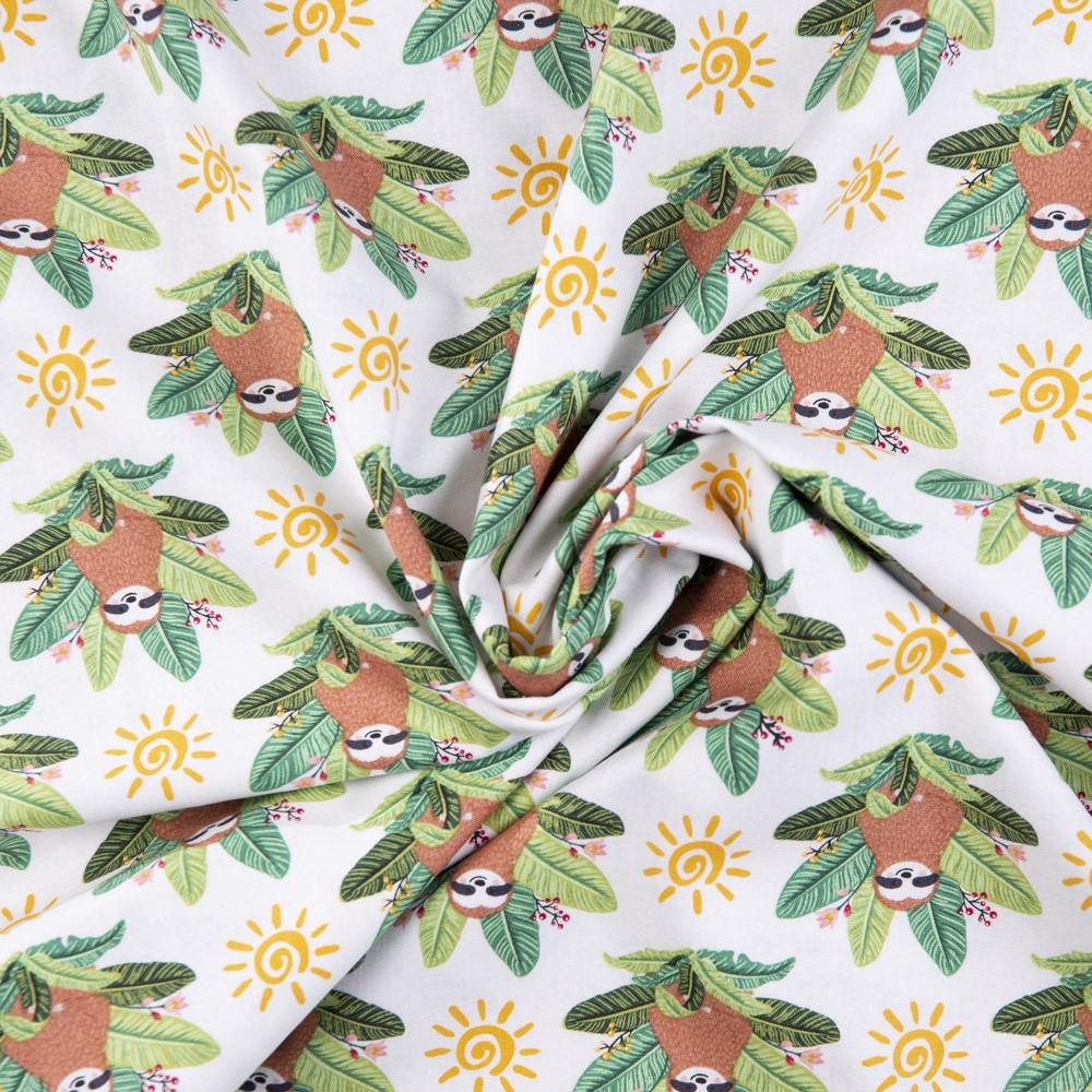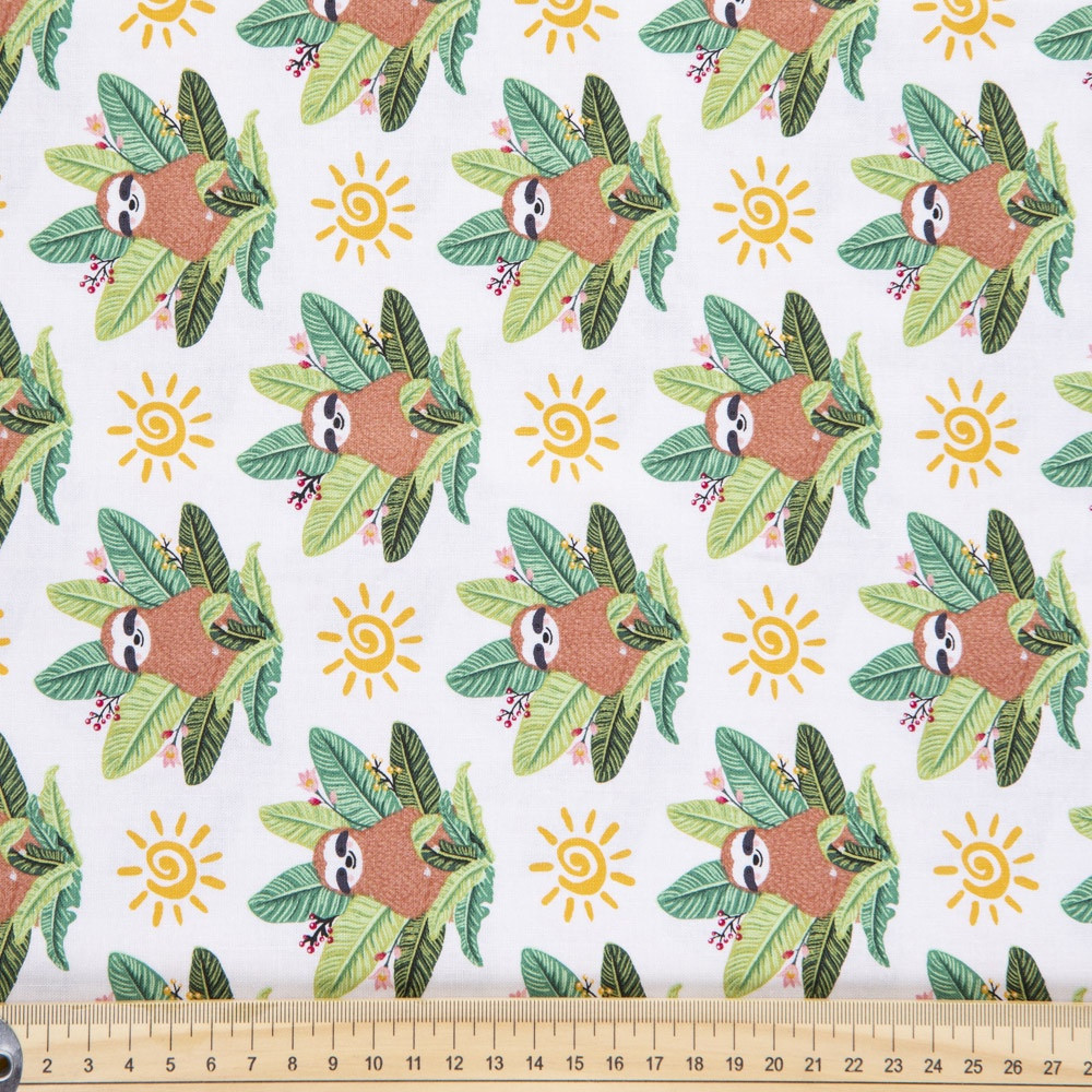Adorable sloths in a bed of leaves scatter this white background. Beautiful, high quality, printed fabric. Ideal for quilting, masks, crafts, displays, table decoration and as a dressmaking fabric.