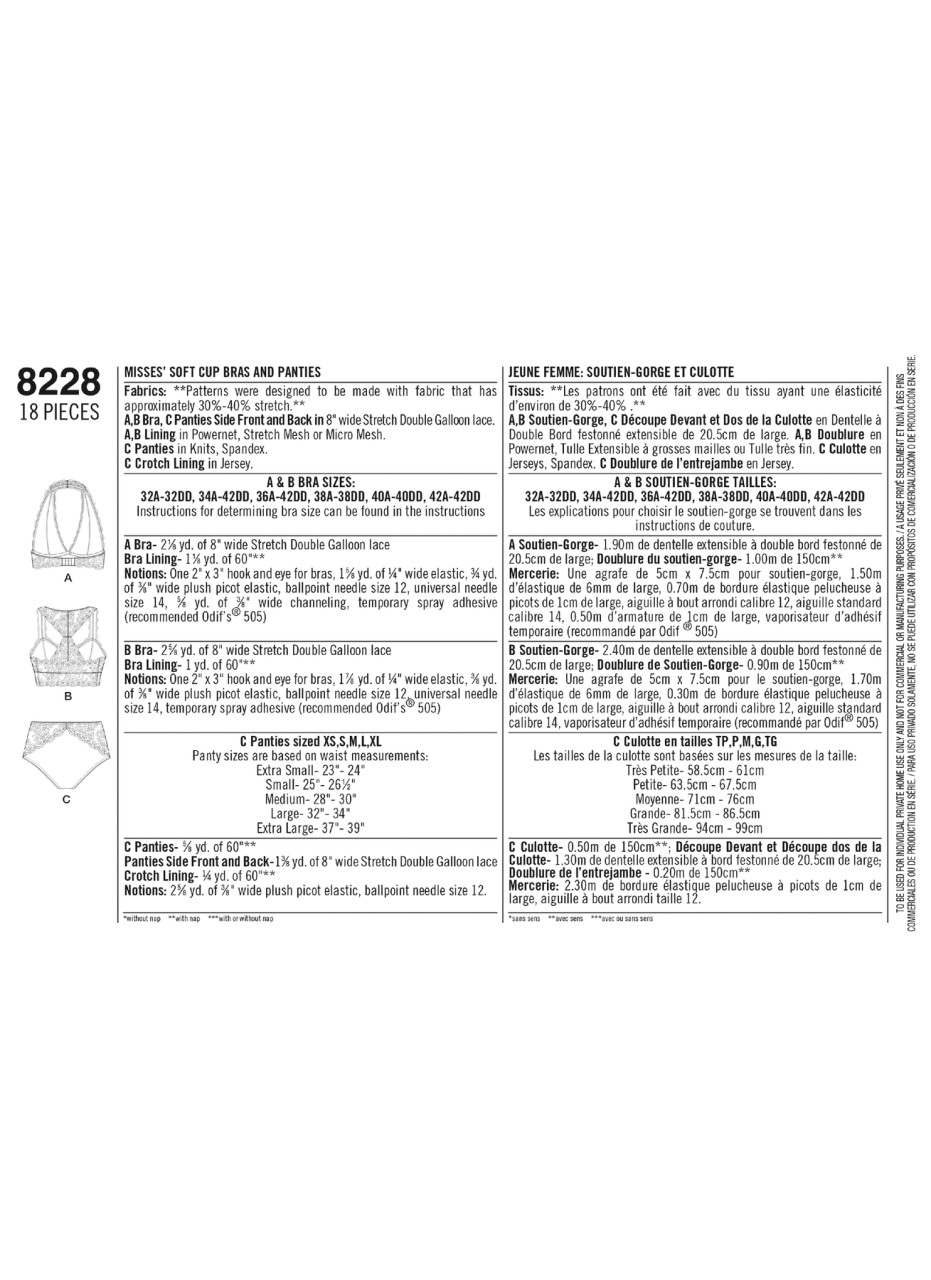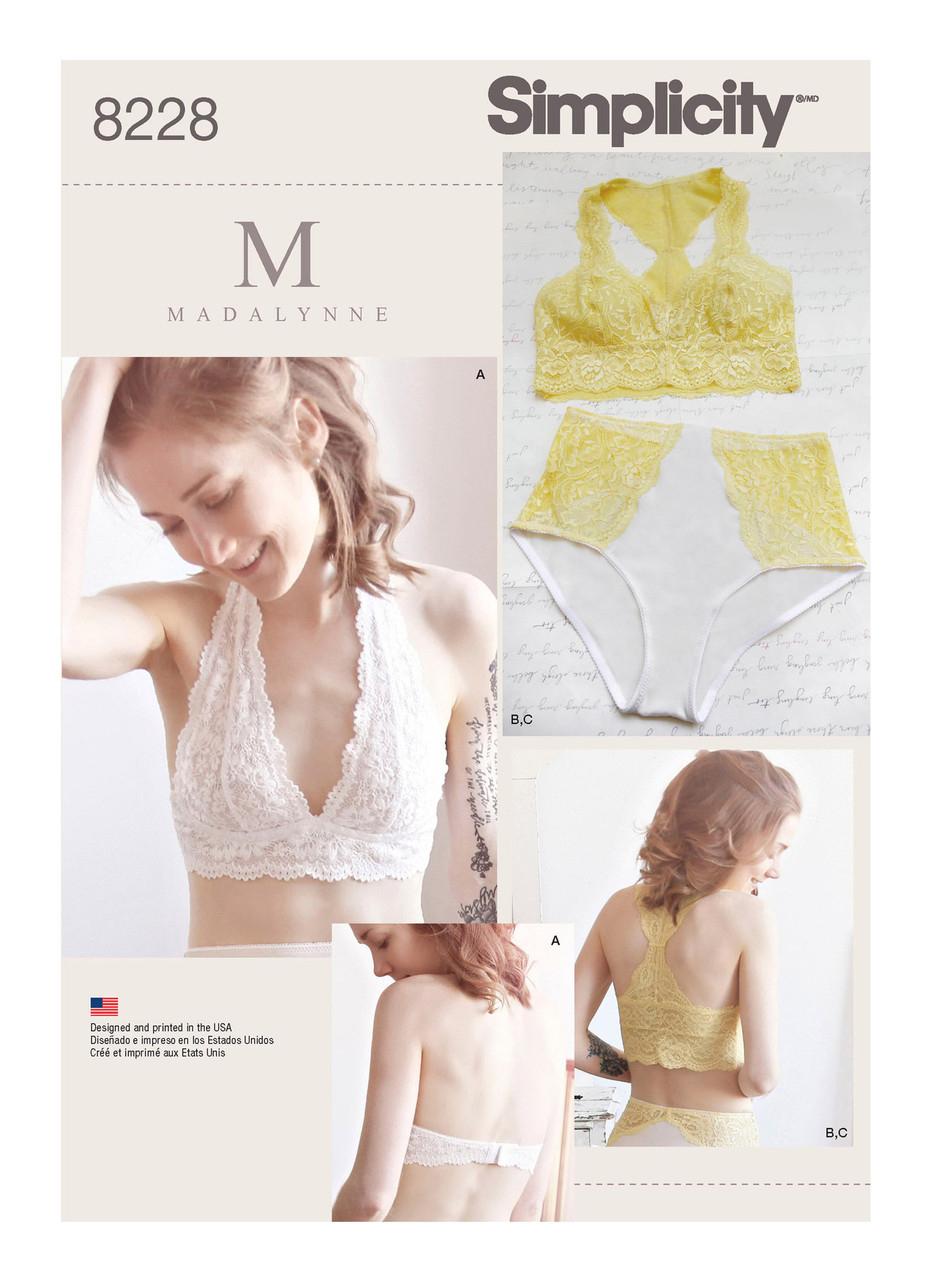 Lovers of lace get inspired with these bra and panties by Maddie Flanigan. Pattern includes soft cup bras in halter or racer back, and panties with scalloped lace trimmings. Bras sized 32A to 42DD, panties sized XS-XL. Instructions for determining bra size are included in sewing instructions, see the back of envelope chart for determining panty sizes based on waist measurements. Bra making with Madalynne.