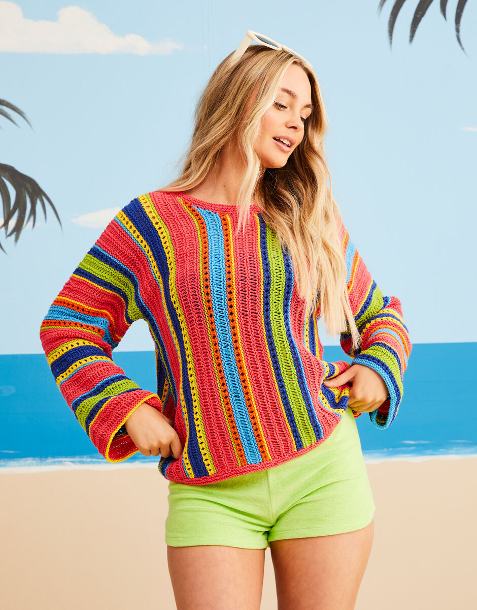 Knit. Beach. Sleep. Repeat. Lacy eyelet and elongated garter stitches give this summer sweater a cool, airy, open effect. Good news for beginners and anyone who doesn't like sewing up too: you knit this pattern in one piece from cuff to cuff with just the side seams to sew-up.
