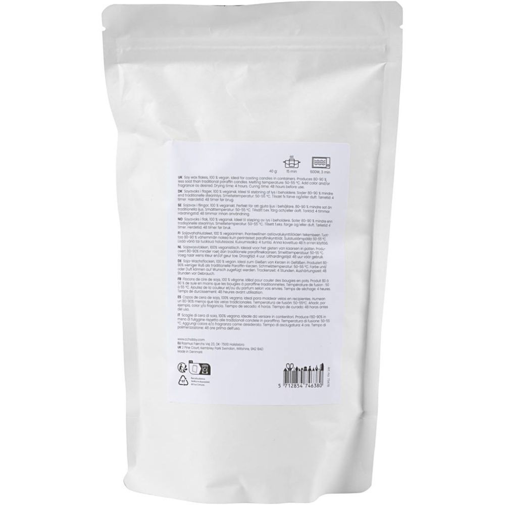 Soy wax in flakes, 100% vegan. Perfect for those of you who want to cast their own candles in jars. Produce 80–90% less soot than traditional candles. Melting temperature: 50–55 °C. Add dye and/or fragrance, for example. Drying time: 4 hours. Curing time: 48 hours before use .