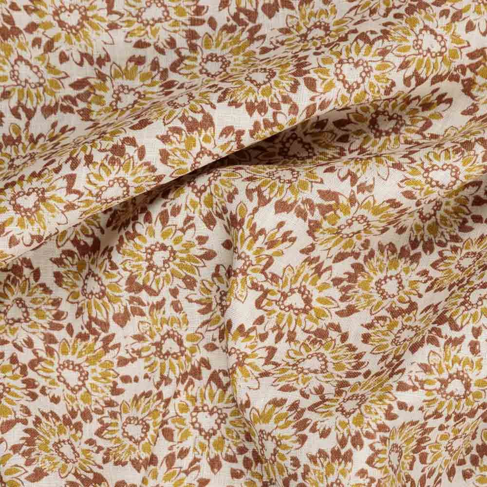 Midweight linen with a softly structured drape, printed on the face with a vintage-inspired floral in warm tan and avocado green tones against a natural beige base. It holds shape beautifully while still allowing for movement, making it ideal for relaxed yet defined silhouettes. Perfect for flowing wide-leg trousers, summer dresses, jumpsuits, and easy shirts with a nostalgic, sun-faded feel.