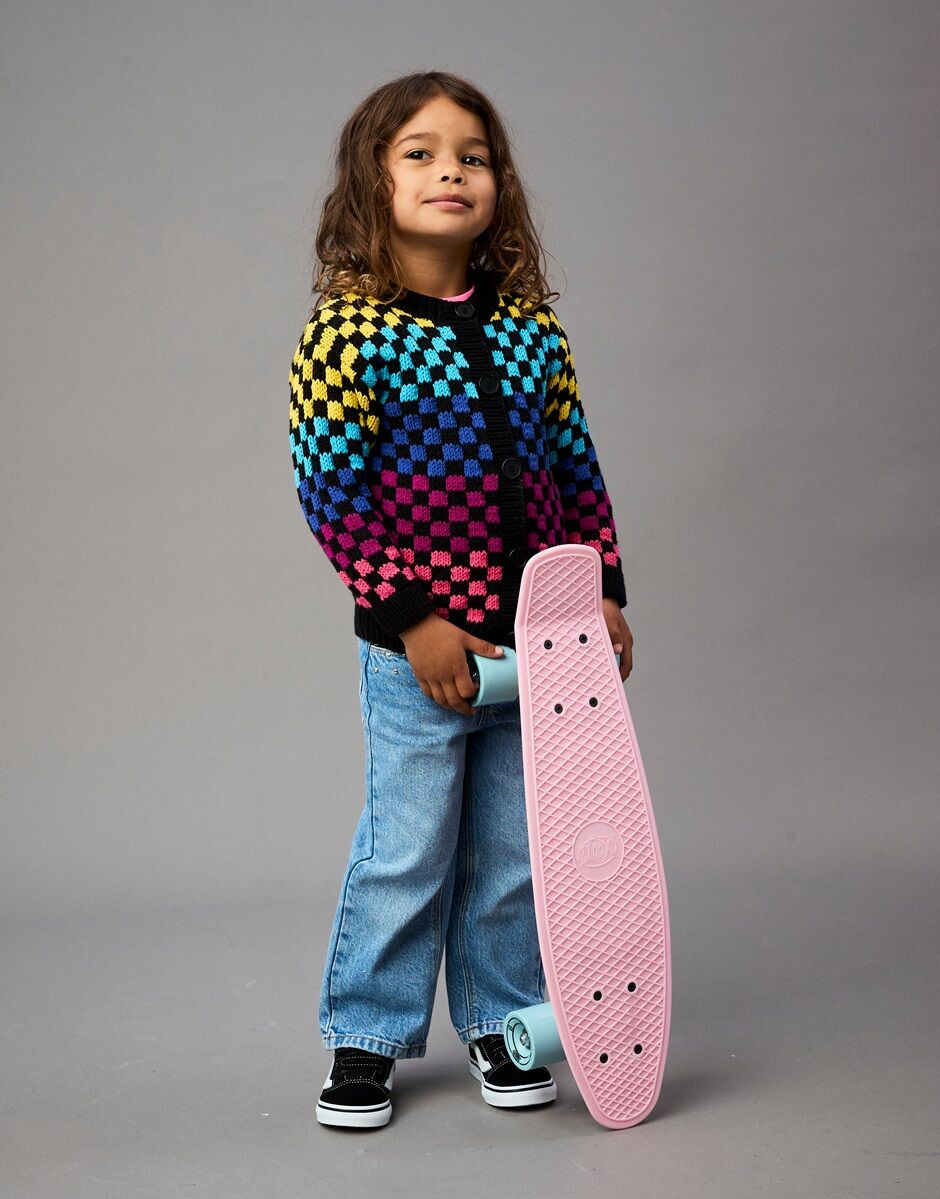 Inspired by the iconic checks of slip-on skate shoes, Kids will love the bright knitted gradient pattern.This is a fair isle pattern your granny wouldn’t recognise but the little racers, rebels and cool kids in your life will love! Cast-on and contrast the brightest shades of Snuggly Replay with Midnight Snack ready for their first board adventures. This easy hand knit cardigan pattern is a great start to your knitting adventure, and great fun for more experienced crafters too.