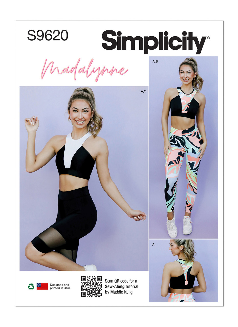 Sleek, stylish sports bralette comes with matching leggings and bike shorts. Bralette features a high neckline with angular princess seams that give a feminine, futuristic look. Leggings and bike shorts have contoured waist band and crotch gusset; shorts feature mesh cut outs.