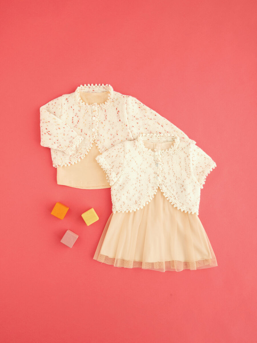 These cute little boleros with delicate picot trim showcase the playful sprinkle of colour in Baby Bonus Spots. In long and short sleeved versions for year-round play date prettiness.