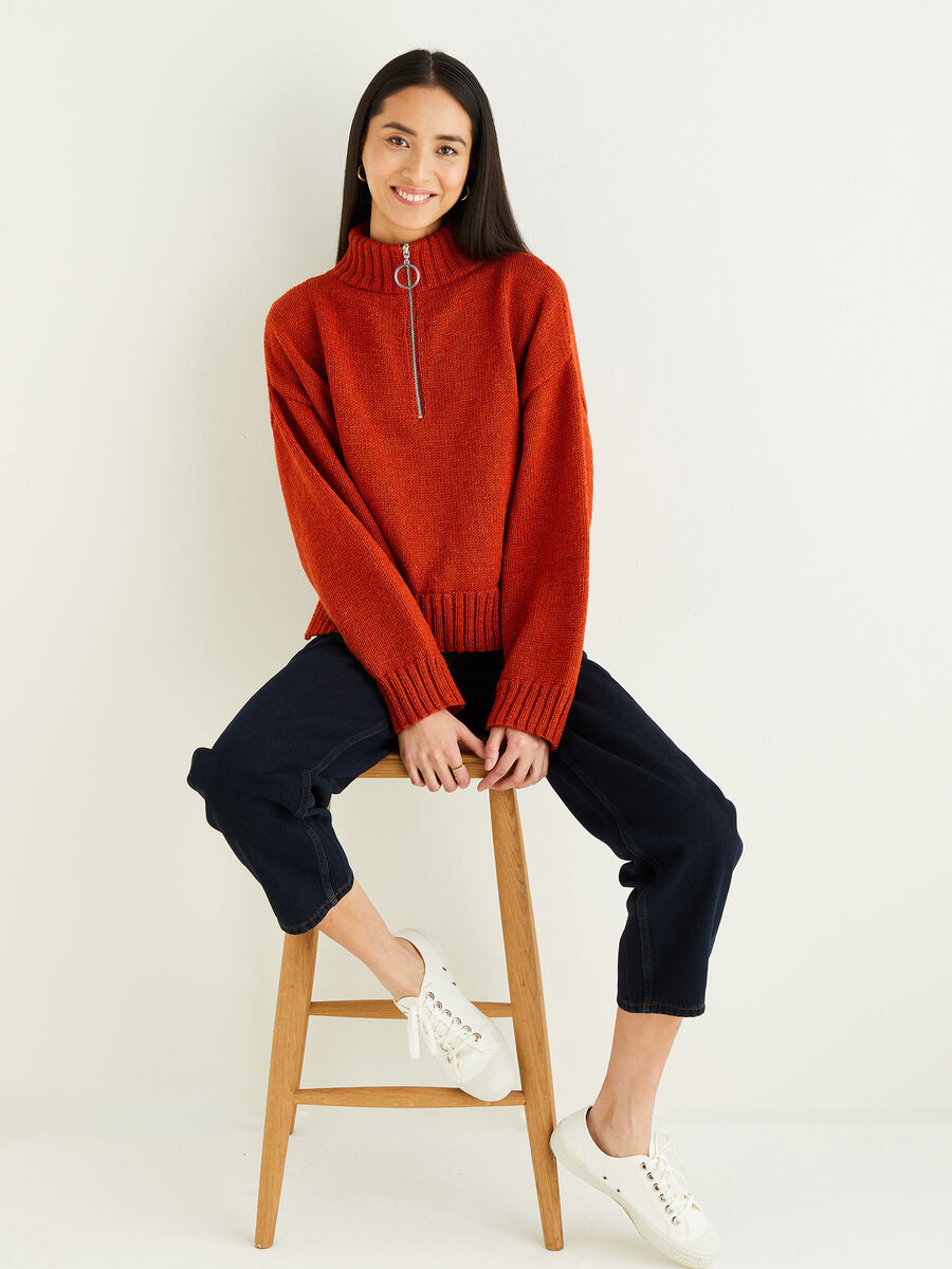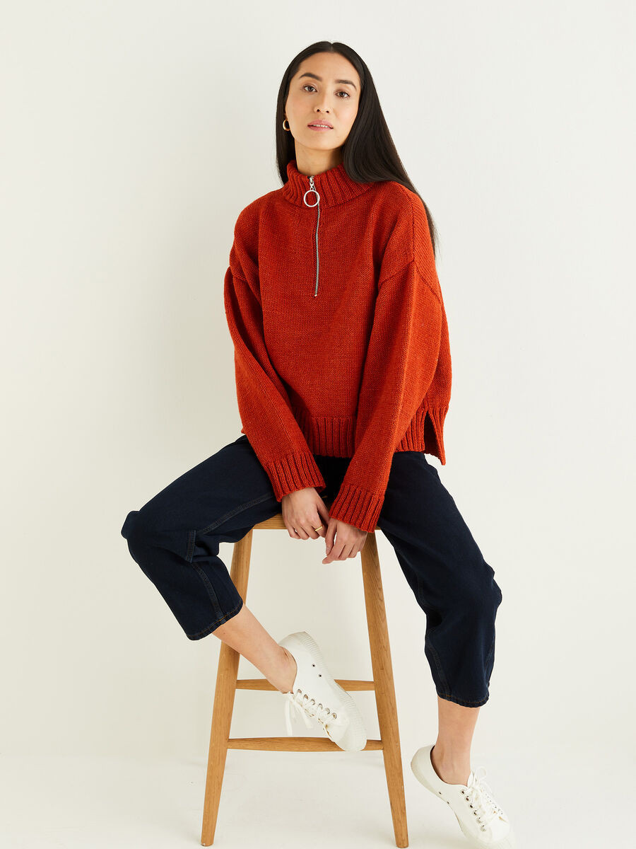 Give a modern classic a soft twist with a statement zip. This relaxed, funnel neck sweater with dropped shoulders and a stepped hem is a surprisingly easy knit in simple stocking stitch and rib. We think this Copper colour looks stunning contrasted with dark denim but you could add your own soft twist by knitting it in a soft neutral or deep shade to complement your wardrobe.