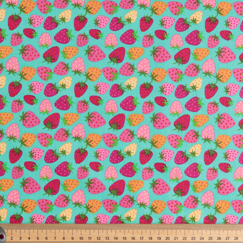 Pink and orange strawberries scattered over a blue background. Beautiful, high quality, printed cotton fabric. Ideal for quilting, masks, crafts, displays, table decoration and as a dressmaking fabric.