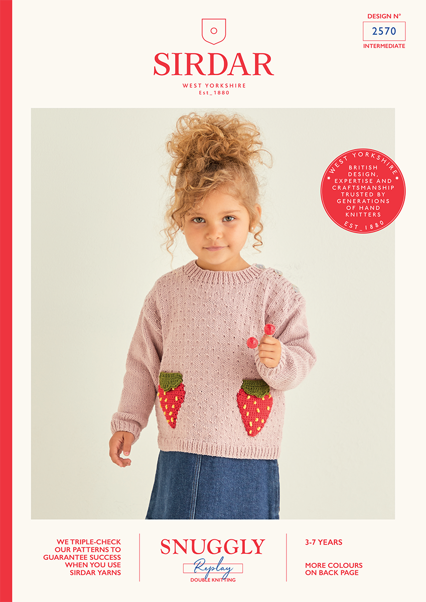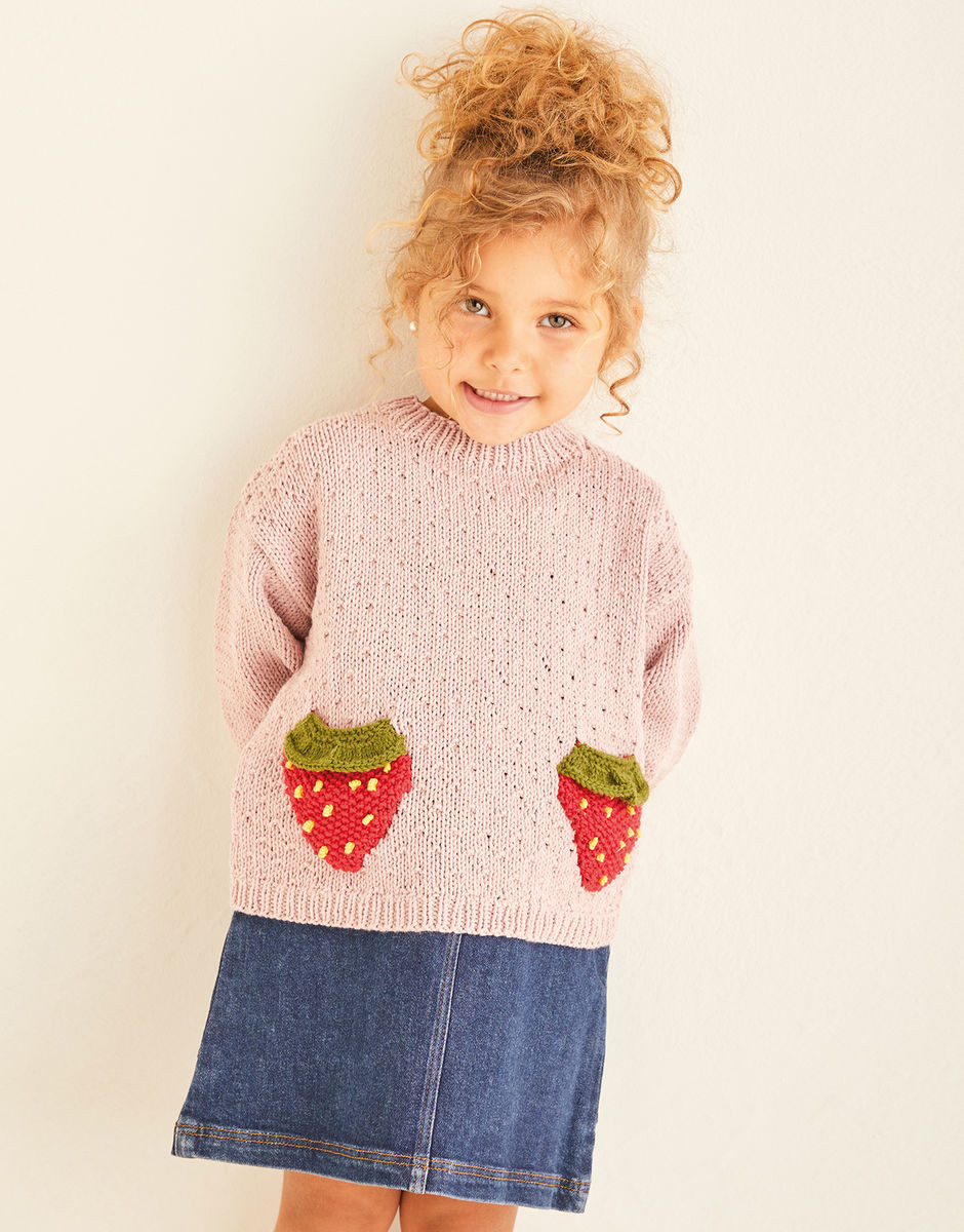 Strawberry patch pockets and all over seed stitch transform a simple v-neck edge to edge or cute round neck sweater for your little sweeties. Berry nice.