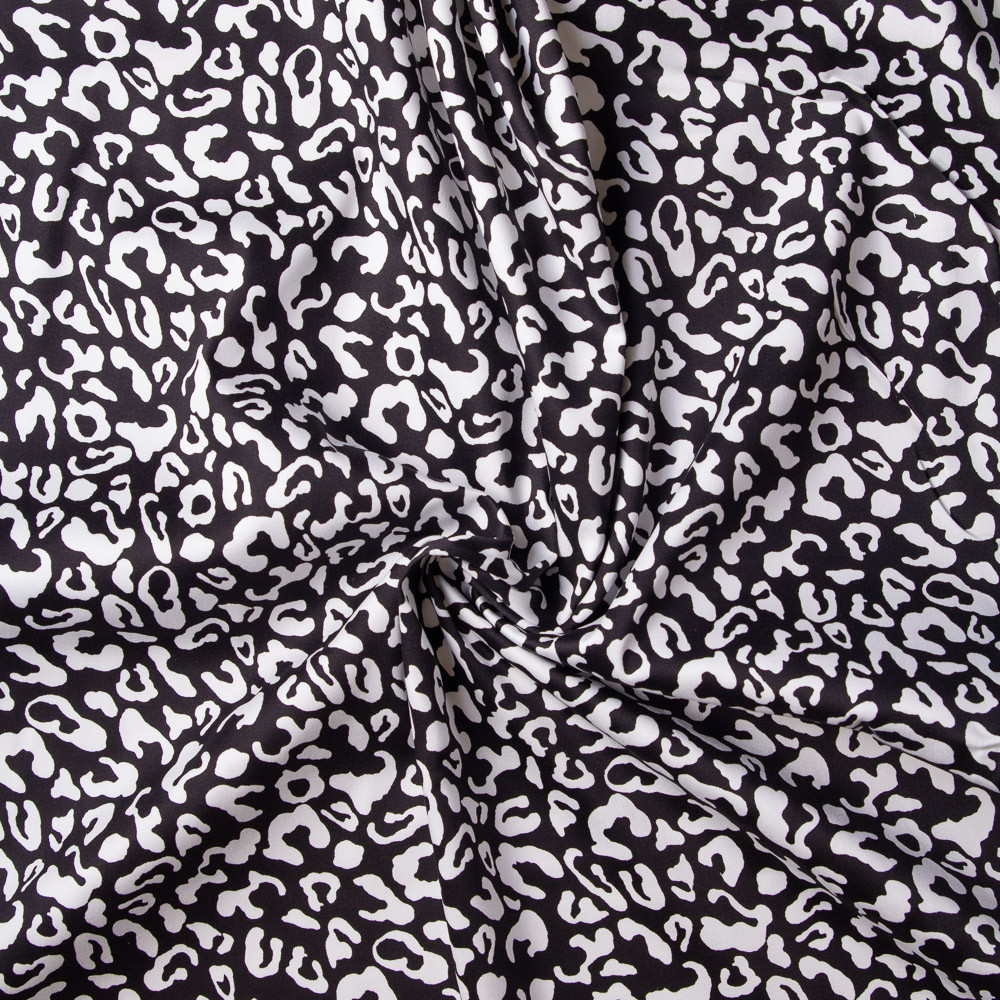 Unleash your wild side with this Monochrome Leopard Stretch Cotton! A cool surface shows off a bold print of white leopard spots on black. taking inspiration from its semi-stiff, flexible drape, sew together body-hugging looks such as a blouse or sheath dress with a billowing peplum, high-waisted wide-leg trousers, shirt dresses, and more!