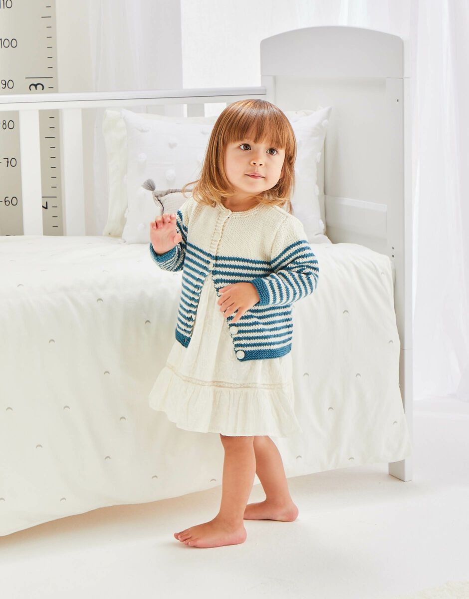 You will knit this sweet, buttoned cardigan in two Sirdar Cashmere Merino shades – only the softest yarn for our little ones. With set in arm holes and the neat striped pattern your child will definitely look the smartest at the next family function.