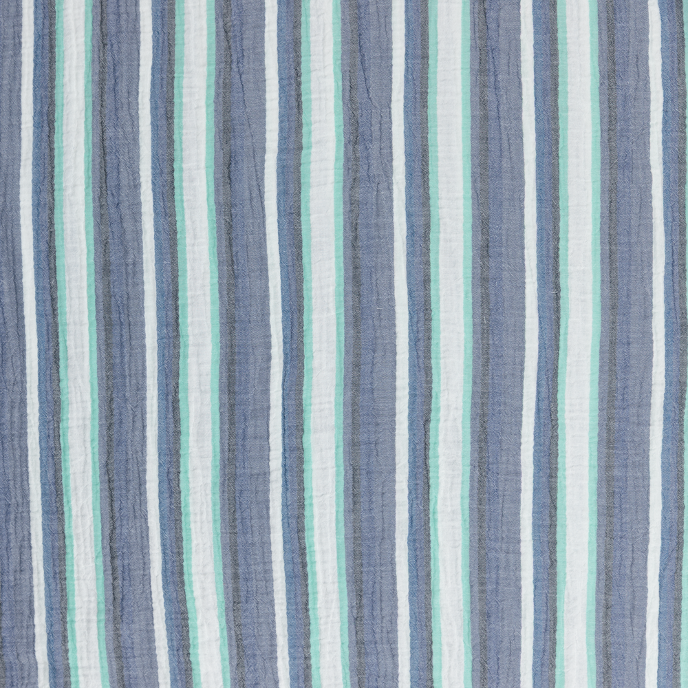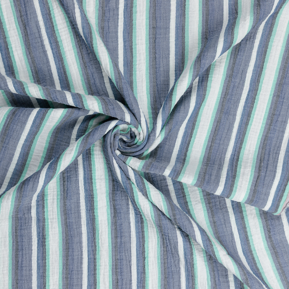 It is the season of stripes, so check out this Striped Cotton Double Gauze! Seriously soft and airy, this woven made of aqua, denim blue, washed black and white stripes is ready for spring and summer. Its relaxed drape adds to its overall casual feel as it falls into soft silhouettes. Flowing tunics, co-ords, layered tanks, and high-low dresses can all be made from the comfortable woven. The double layers adds to its thickness, yet the gauze still remains translucent. Insert a lining for more opacity.