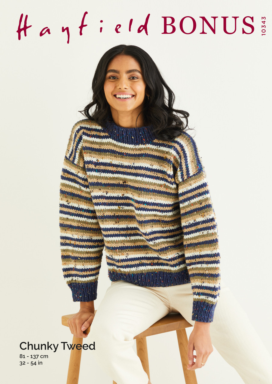 This might be an easy knit but tweedy stripes transform the simple stocking stitch of this crew neck sweater into something much more striking. Solid, colour-block ribs pull everything together and will great with weekend denim.