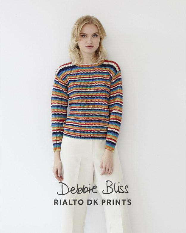 Knit up this colourful rib sweater using Debbie Bliss Rialto yarn. This pattern fits chest size 81-107cm.