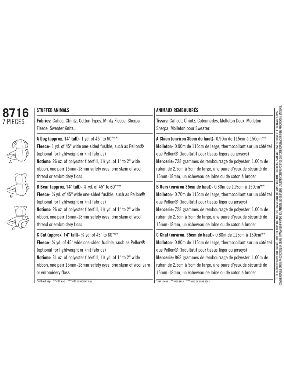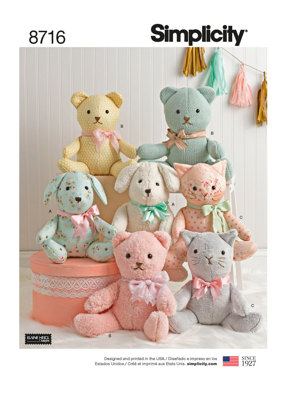 Choose calico or chintz, fleece or sherpa, even a sweater knit to make these adorable stuffies by Elaine Heigl Designs. The pattern includes a stuffed bear, kitty, and dog, and all options feature a bow tie.