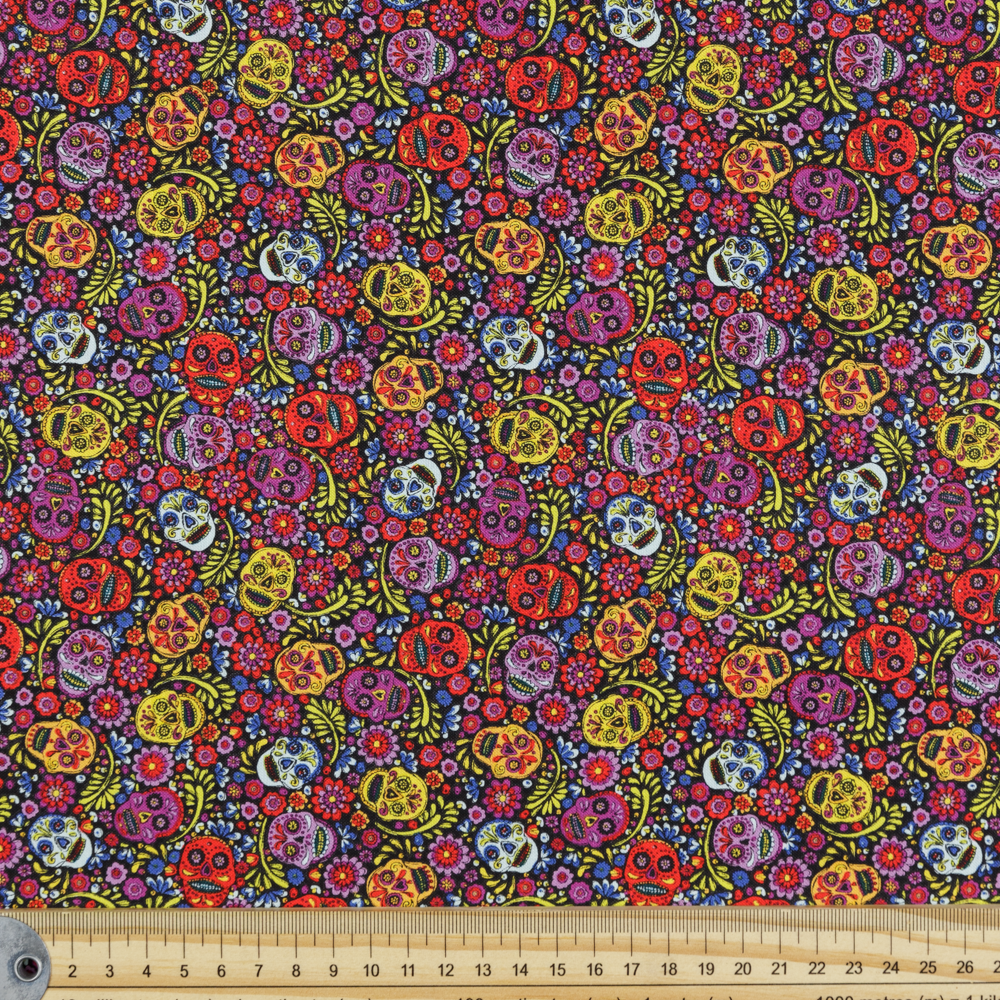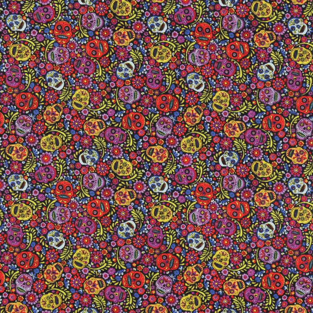 Dia De Los Muertos (Day of the Dead) themed print of colourful skulls in tones of red, purple and yellow/ Beautiful, high quality, printed cotton fabric. Ideal for quilting, masks, crafts, displays, table decoration and as a dressmaking fabric.