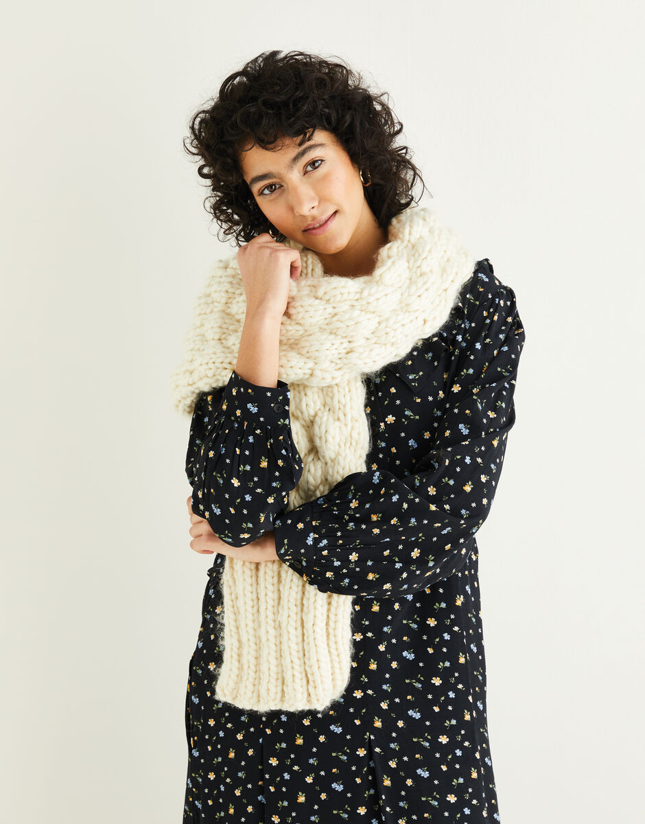 Cocoon yourself in a super soft, super cosy, super-sized scarf in super chunky Sirdar Adventure this winter. The exaggerated silhouette and bold textured stitch transform this hand knit into a style statement. Cast on today and you'll be done by the weekend!