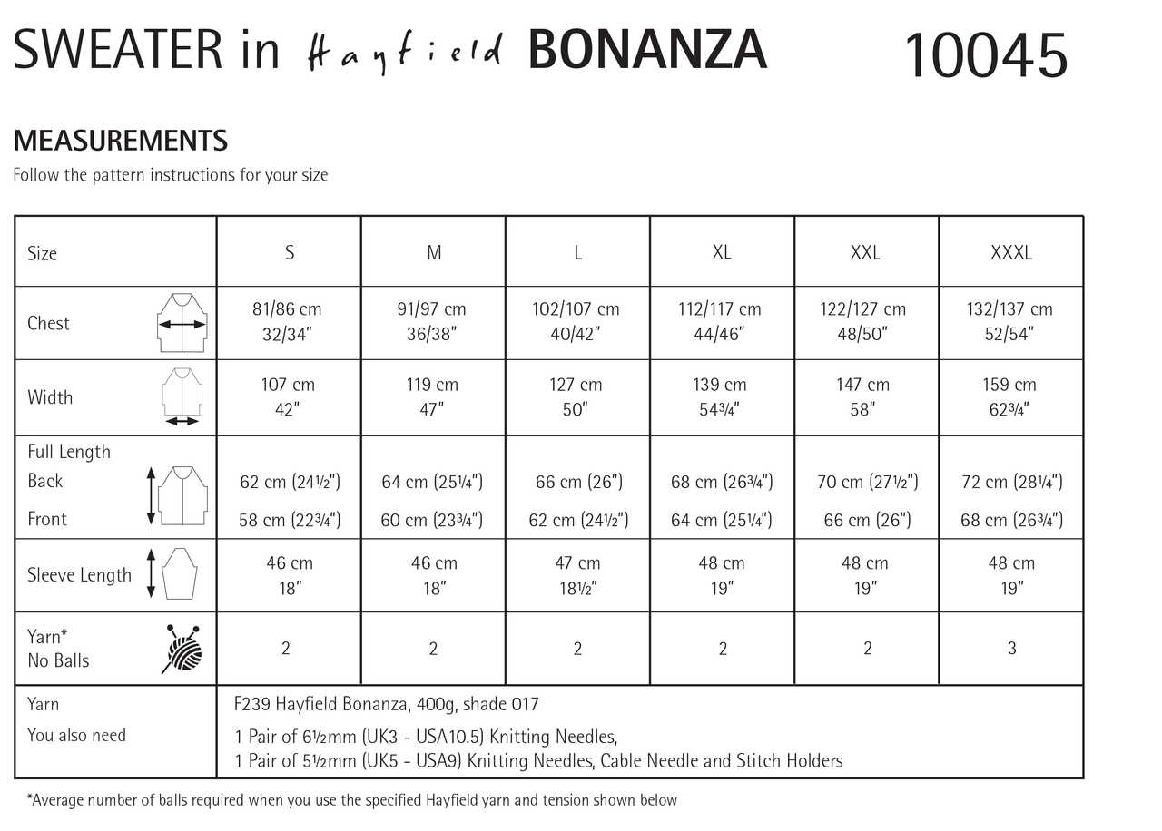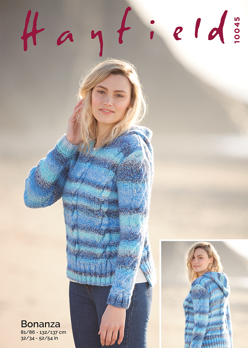 Intermediate knitters will love this hooded sweater with cables running down the front and sleeves. Finished off with rib trims and side vents for a flattering fit, this sweater is knitted in our self striping Hayfield Bonanza yarn. Make it for sizes UK 8-26 (USA 4 -22).