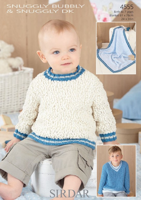 Sweaters in Sirdar Snuggly Bubbly and Snuggly DK Baby Yarn. Bubbly is a lovely pompom texture yarn from Sirdar. Sizes are from Birth to 7 years, 16 to 26ins (41 to 66cm).