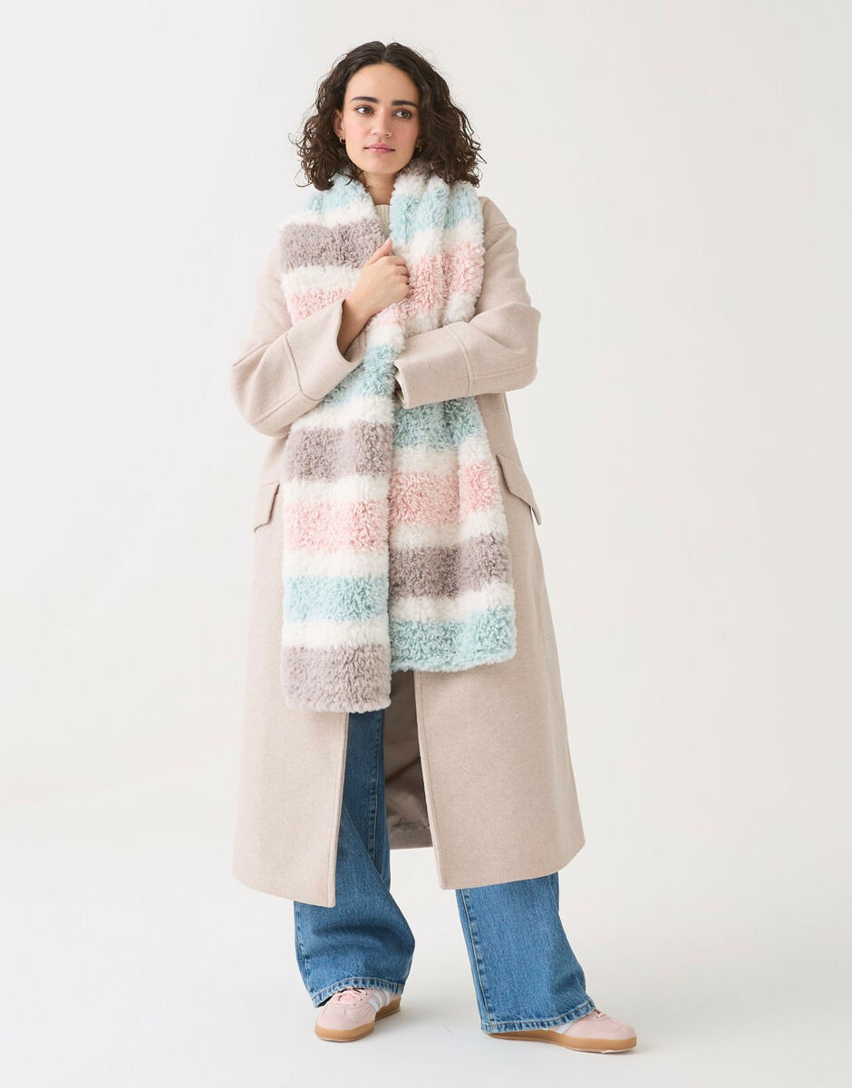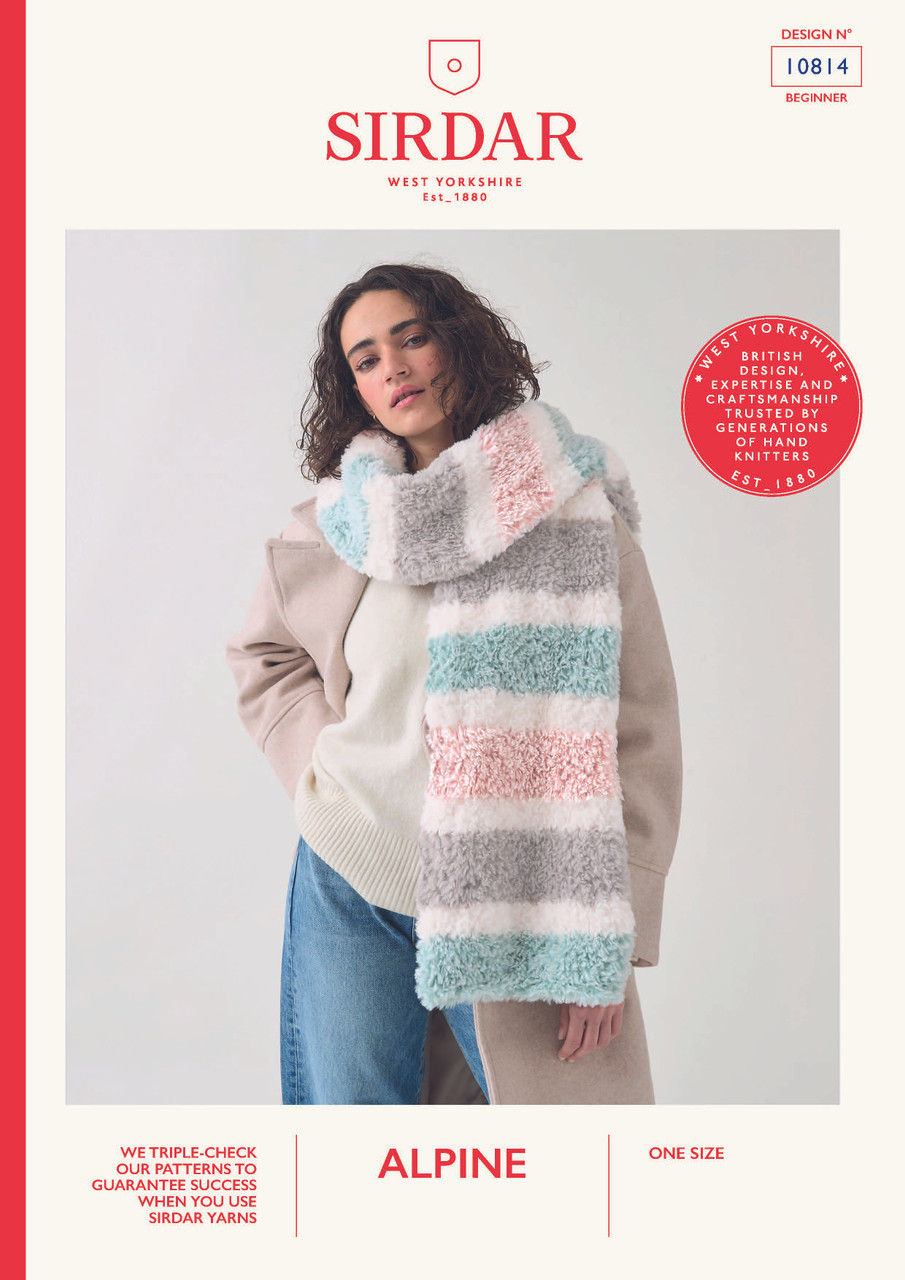 With a simple stripe design, this generous scarf is suitable for beginners to knit a cosy winter accessory in no time. Knitted in soft, fluffy Sirdar Alpine for a beautiful fur effect.
