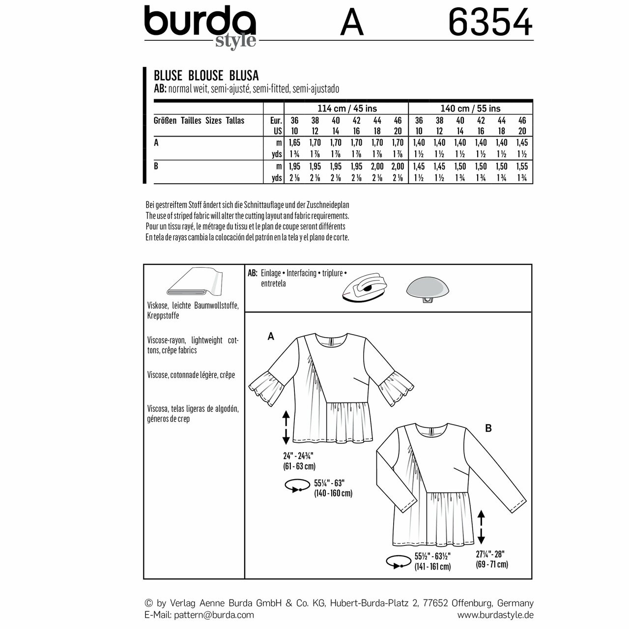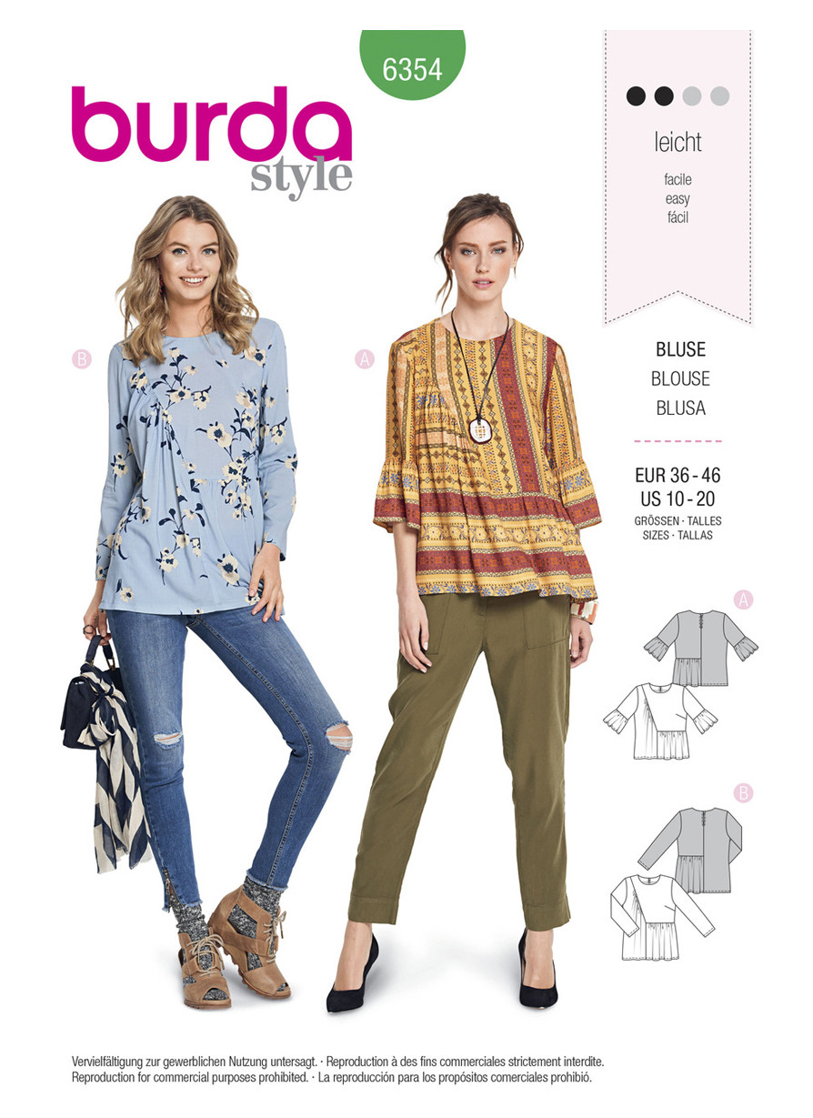 Designer blouse with swingy styling. The angled seam on the front and attached frills create a youthful impression. Choose between frilled sleeves or sleek, long sleeves.