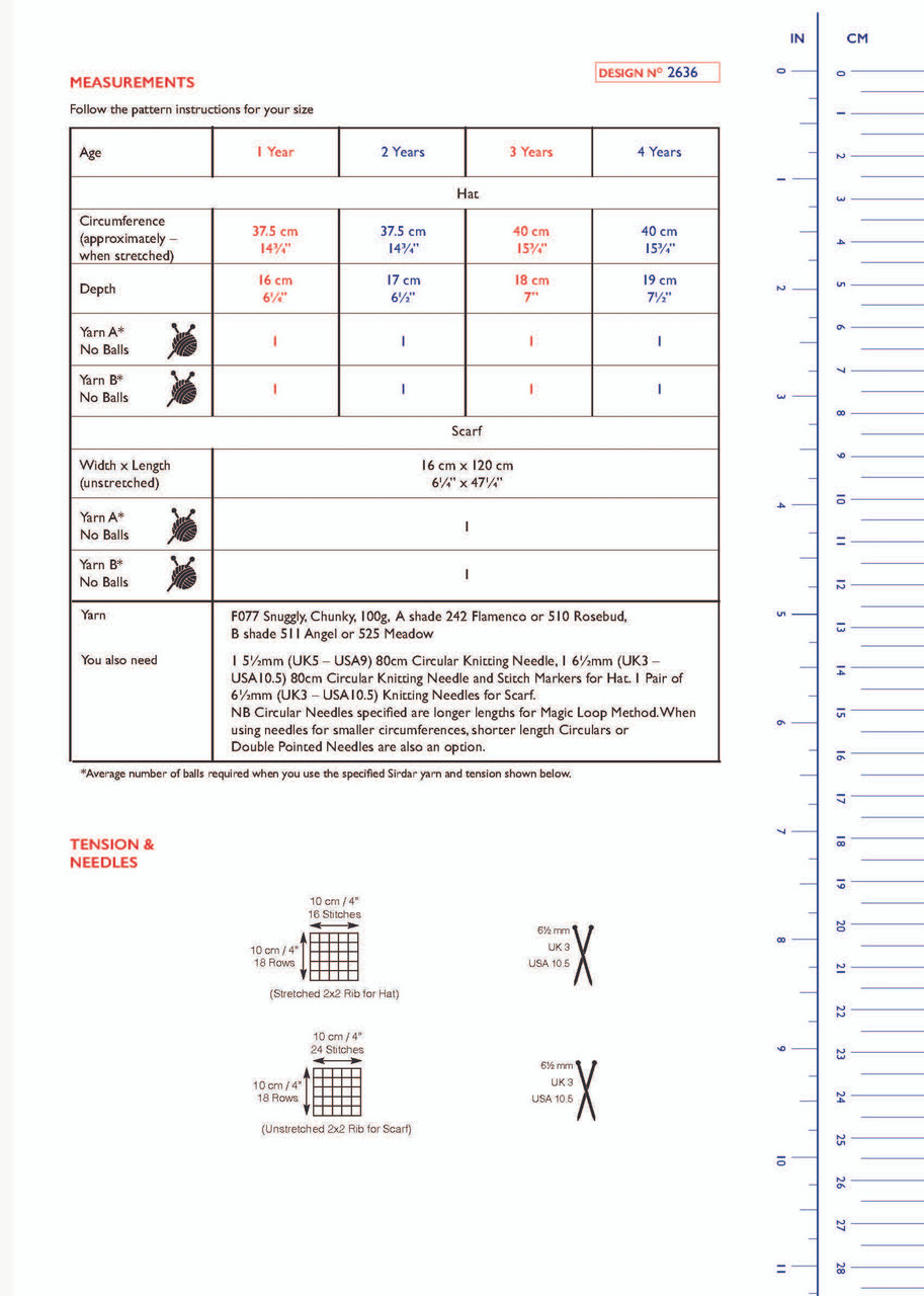 1 5½mm (UK5 – USA9) 80cm Circular Knitting Needle, 1 6½mm (UK3 – USA10.5) 80cm Circular Knitting Needle and Stitch Markers for Hat. 1 Pair of 6½mm (UK3 – USA10.5) Knitting Needles for Scarf.