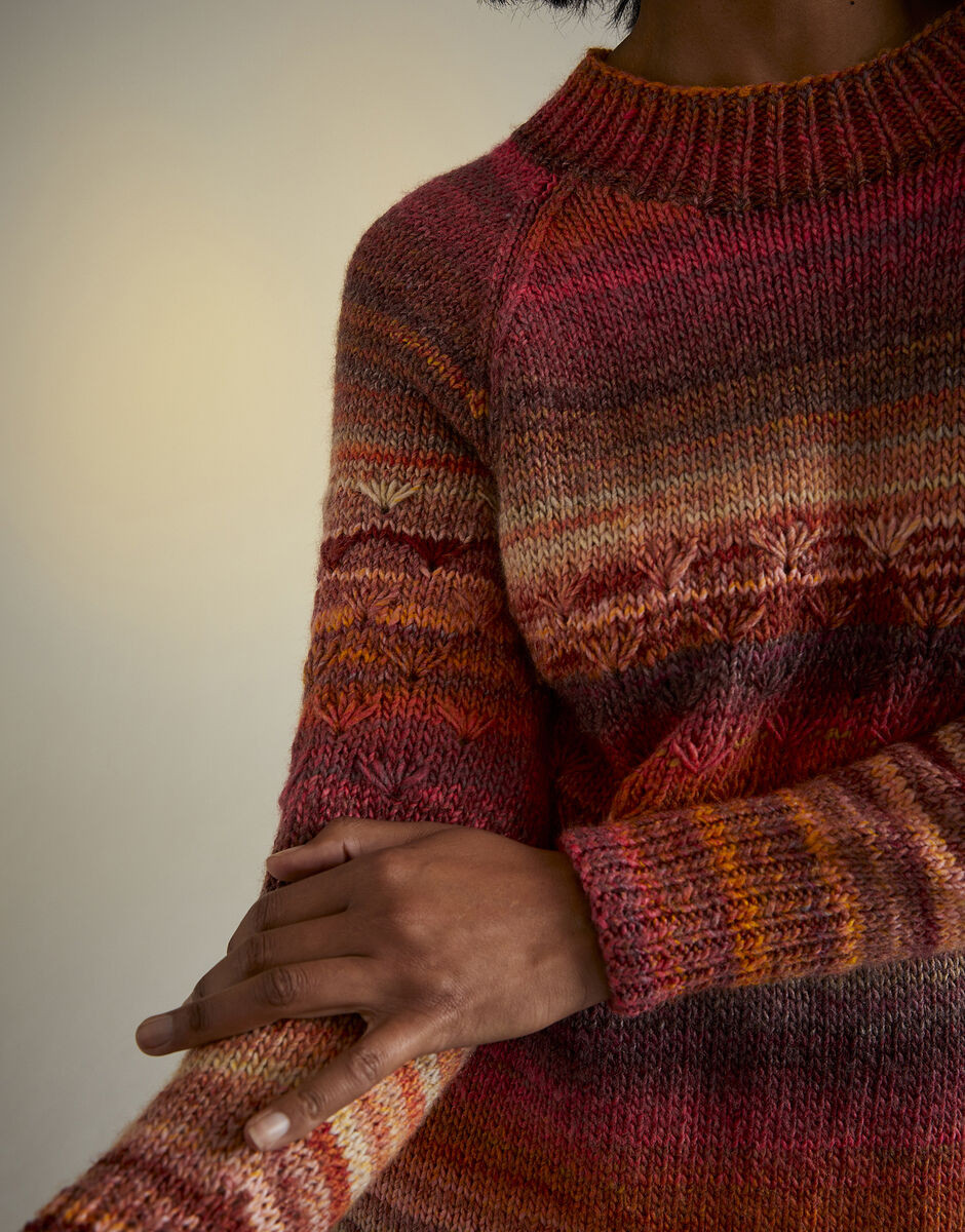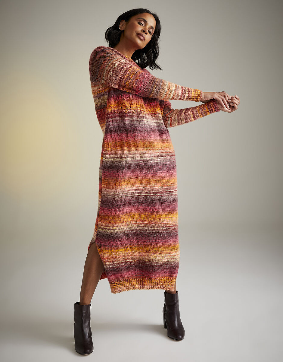 The Tall Poppies Dress is a hand knitting pattern worked in stocking stitch in stunning, self-striping Sirdar Jewelspun. The panel of pretty dandelion stitch around the bodice continues elegantly across the fully-fashioned raglan sleeves. The side splits are edged with rib to add stability and prevent curling.